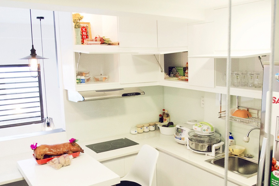 Tông màu trắng tạo cảm giác sạch sẽ, ngăn nắp và thông thoáng. Gian bếp với những vật dụng đơn giản.