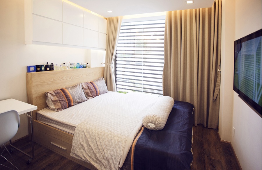 Phòng ngủ của nam chủ nhân có phong cách hiện đại, nội thất bằng gỗ ấm áp, tạo cảm giác thư giãn và thân thiện.