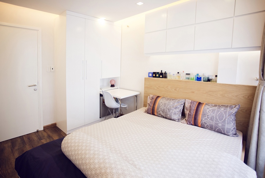 Bộ chăn ga, gối có tông màu trắng và xanh đậm được chủ nhân chọn lựa làm nổi bật cả gian phòng.