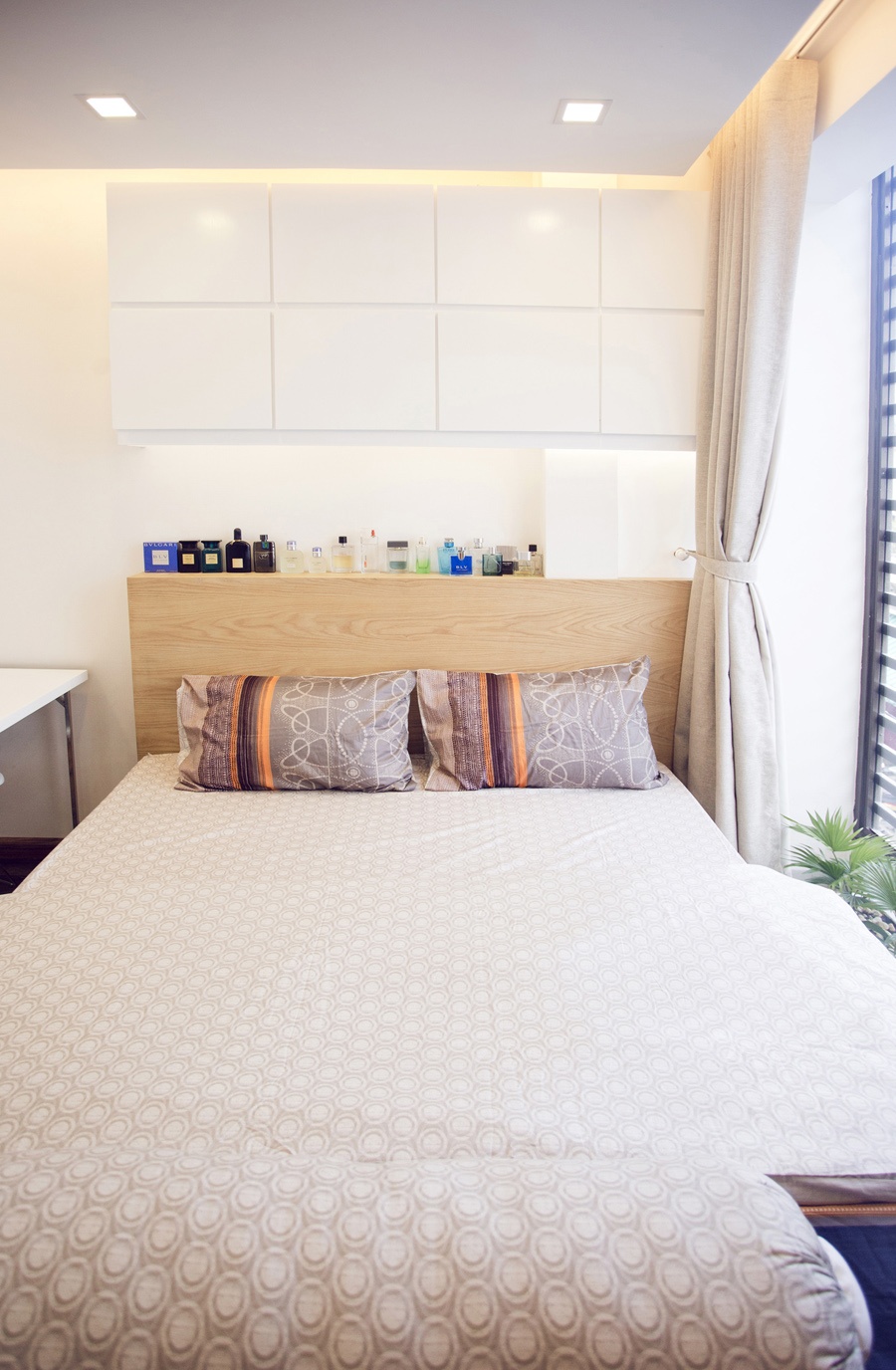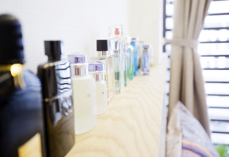 Phía trên gường ngủ là nơi đặt bộ sưu tập nước hoa mà Đỗ Long yêu thích và thường xuyên sử dụng.