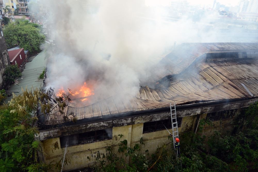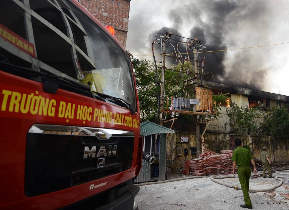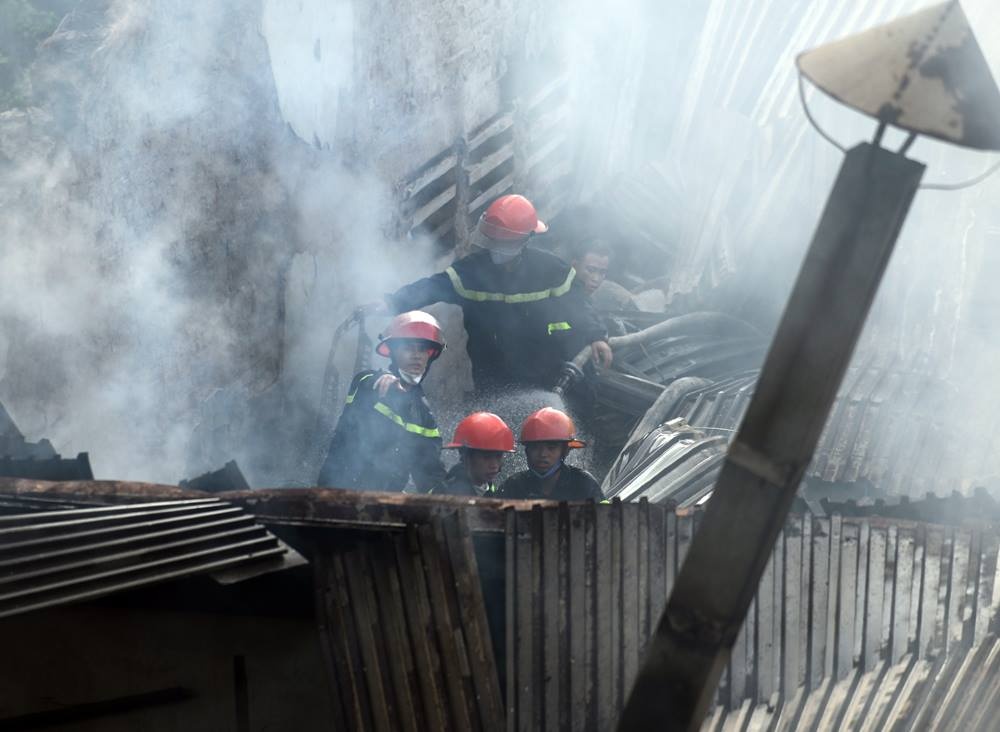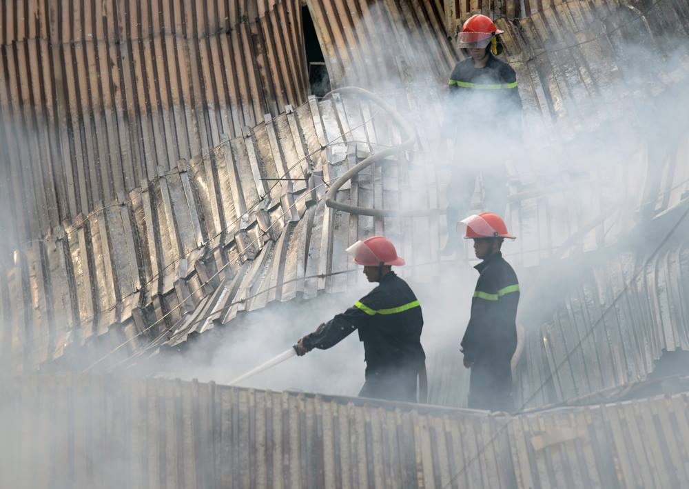 | 16h50, khoảng 500 m2 mái nhà xưởng đã sụp đổ. Vị trí ngọn lửa bùng phát nằm sâu bên trong, cách trục đường chính hàng chục mét, có tường cao ngăn cách. |