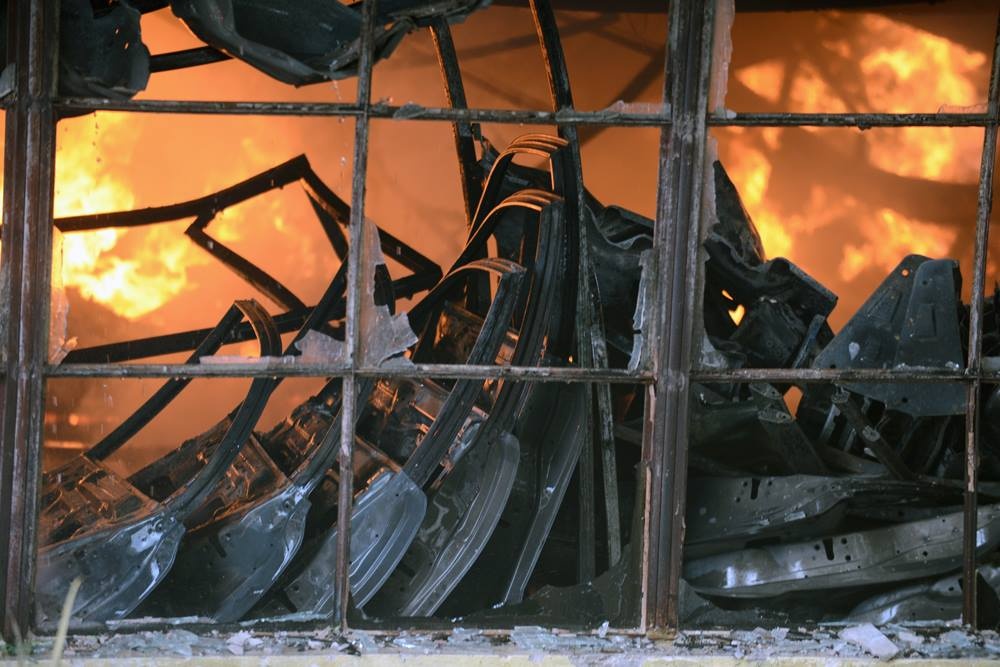 | Lửa bén vào kho, nơi chứa nhiền bộ phận để lắp ráp ôtô. |