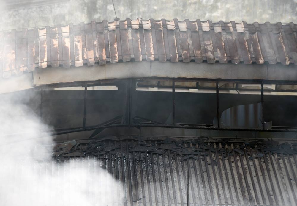 | Sức nóng từ đám cháy làm vỡ kính trên nóc kho. |