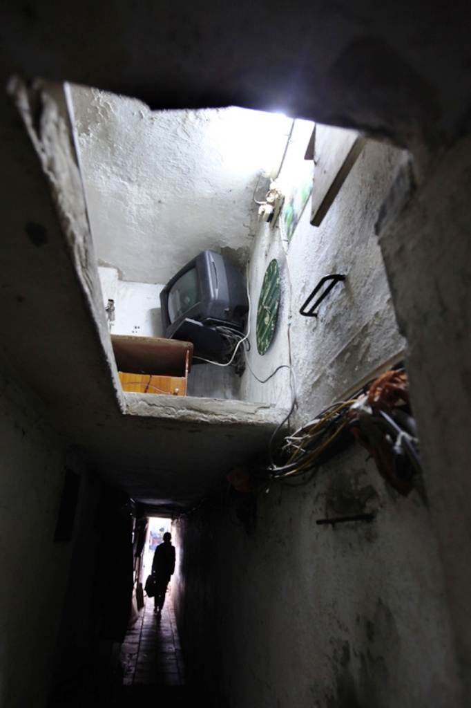 Trái với vẻ ngoài hào nhoáng, sầm uất ở mặt tiền phố cổ, sâu trong con ngõ 44 Hàng Buồm là những căn nhà vỏn vẻn trên dưới 10 m2. Bước chân vào ngõ, nơi đây như biến thành một căn hầm thực sự.