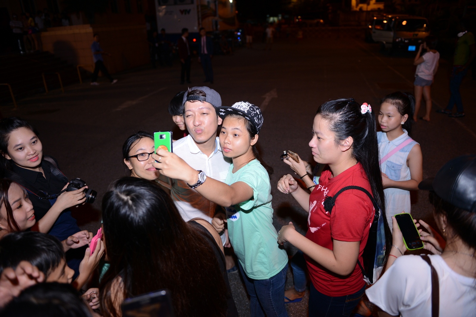 Một khán giả lớn tuổi nhận ra và chụp ảnh cùng Trường Giang. Gần đây, diễn viên hài sinh năm 1983 bị đồn thổi có chuyện phim giả tình thật cùng Nhã Phương sau khi tham gia dự án 49 ngày. Dù tay nắm tay và diện trang phục ton sur ton đi dự họp báo, cả hai đều úp mở trước những câu hỏi xoay quanh chủ đề này.