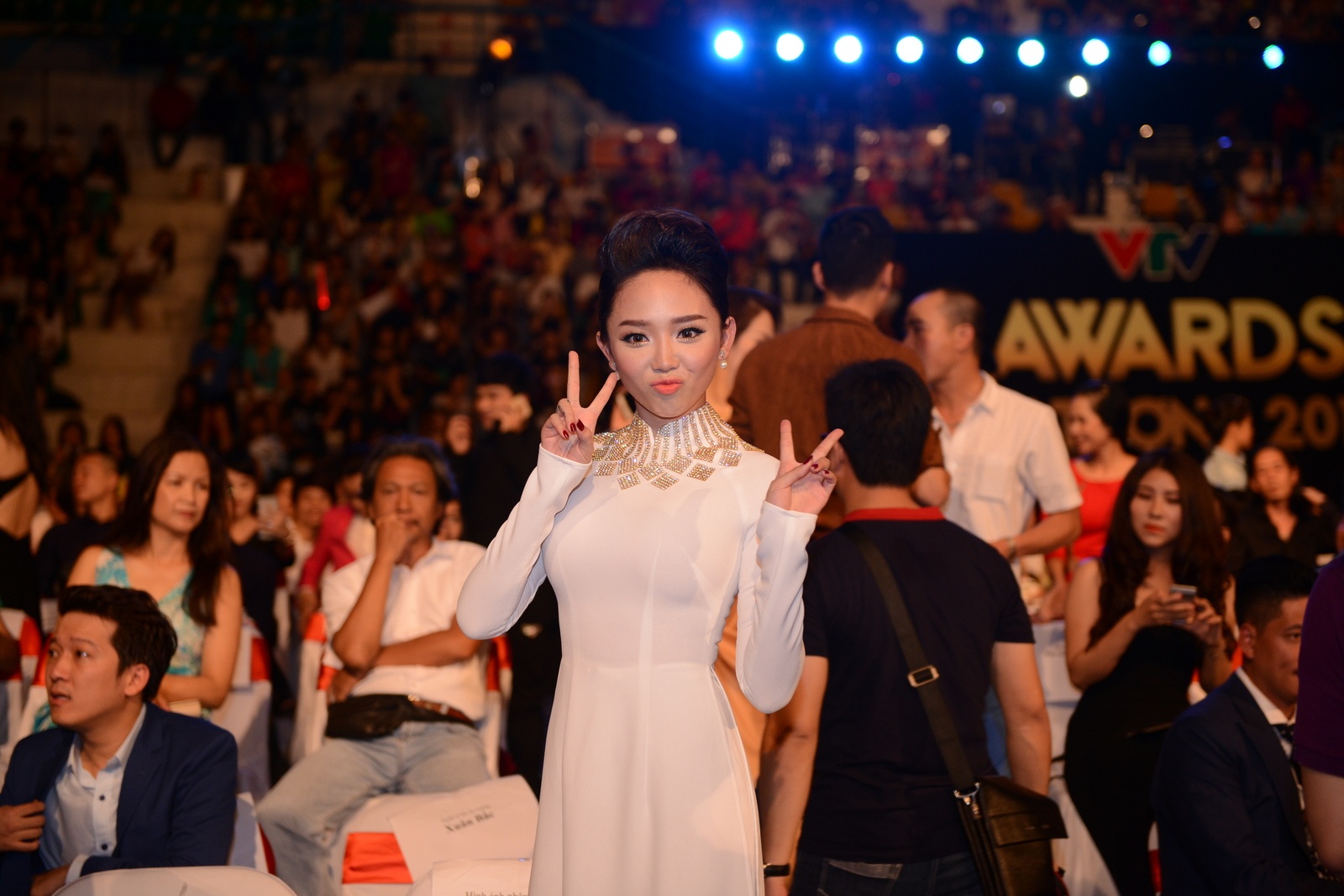 Tóc Tiên cũng có mặt trong đề cử nữ ca sĩ ấn tượng. Khác với phong cách gợi cảm mọi khi, giọng ca Ngày mai nữ tính trong trang phục áo dài truyền thống.