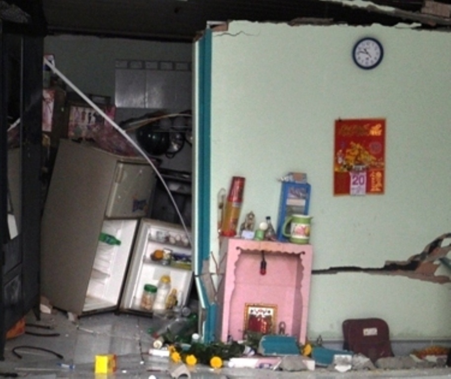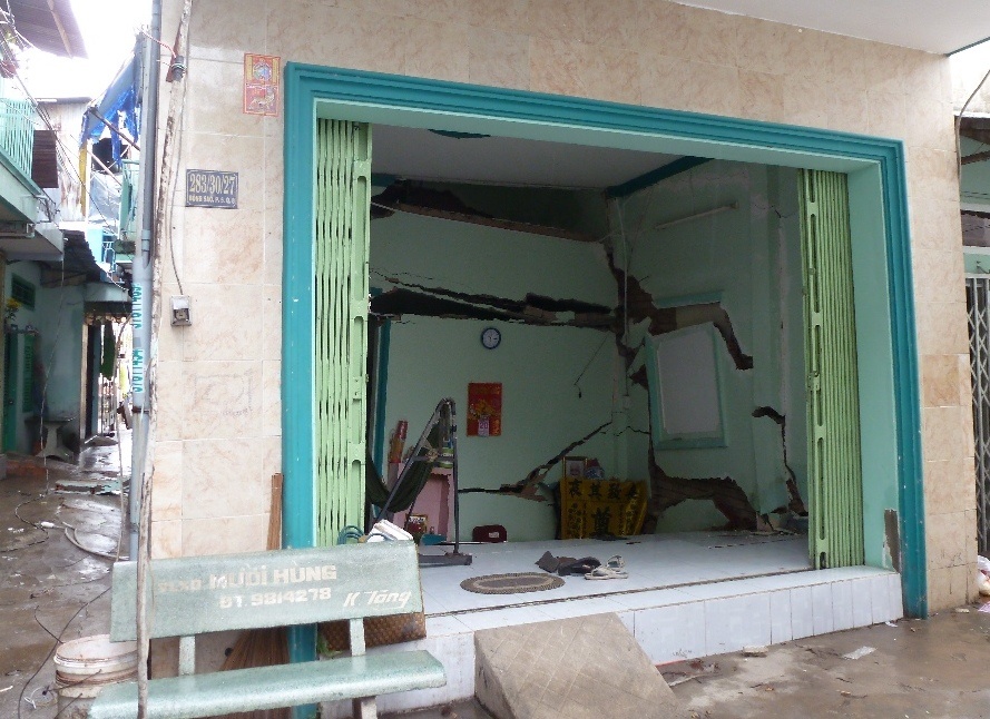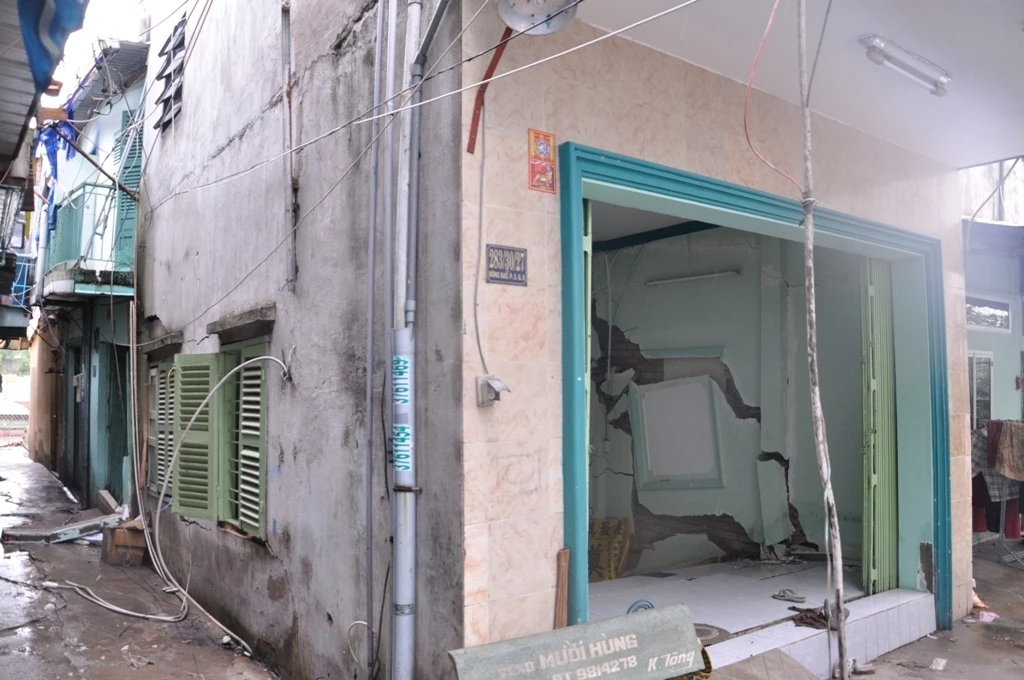 Tại hiện trường, tại căn nhà 283/30/27 do Phùng Thị Kim Con (SN 1959, quê Bạc Liêu) thuê sống cùng chồng và con trai là Nguyễn Hoàng Vũ (SN 1986), nền nhà bị sụt lún rất sâu, gạch lót bong tróc. Nguy hiểm nhất là tường nhà nứt toác, vỡ từng mảng, liên tục rơi xuống.
