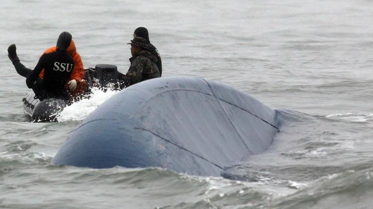 Lực lượng cứu hộ đã bơm khí oxy vào tàu lúc 22h50 phút tối qua. Chính phủ Hàn Quốc hi vọng phần đuôi tàu nổi lên trên mặt nước sẽ tạo khoảng trống có không khí giúp nạn nhân kẹt trong tàu sống sót lâu hơn. Ảnh: Reuters