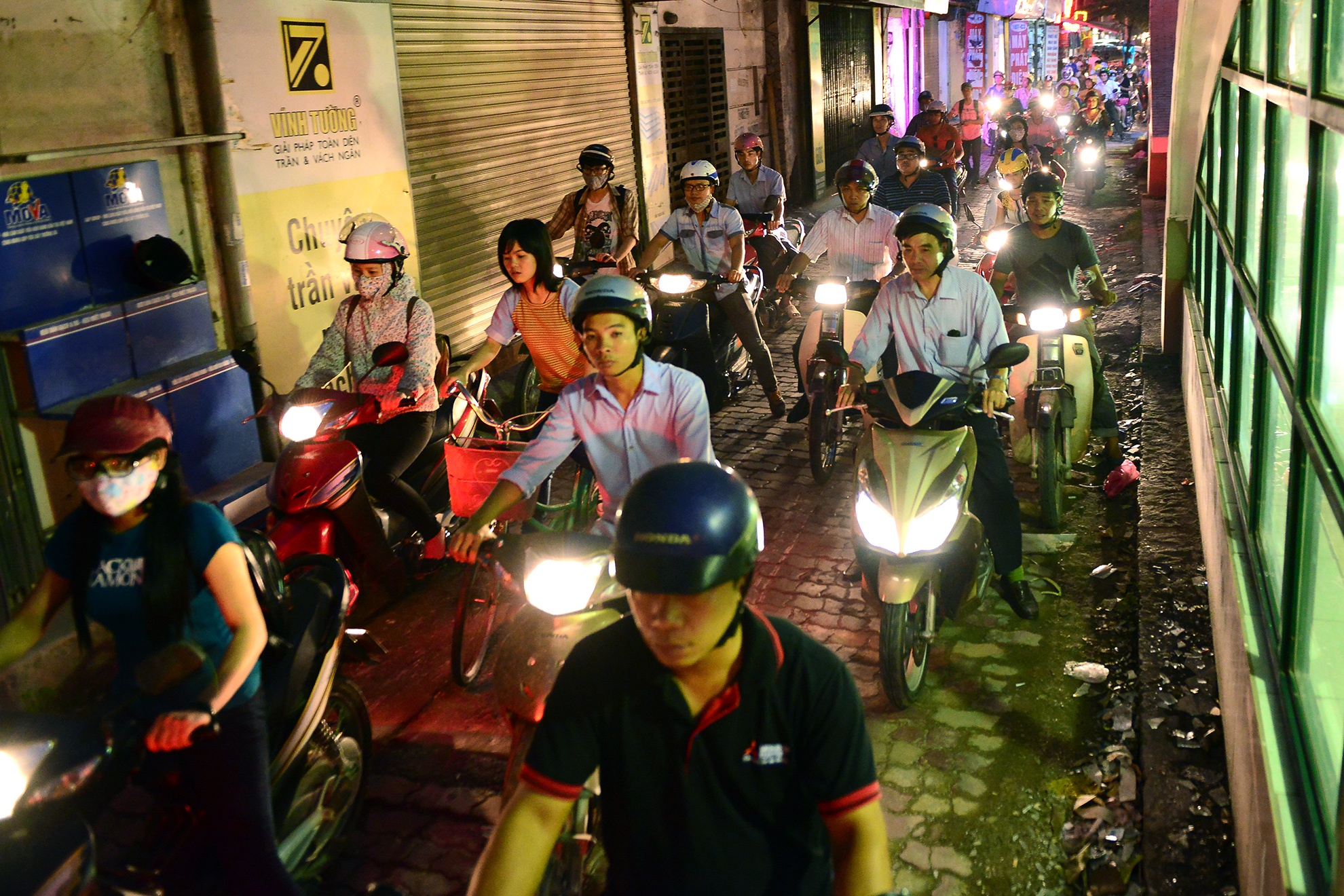 Buổi tối, xe máy, ô tô đi lẫn vào làn đường của nhau.