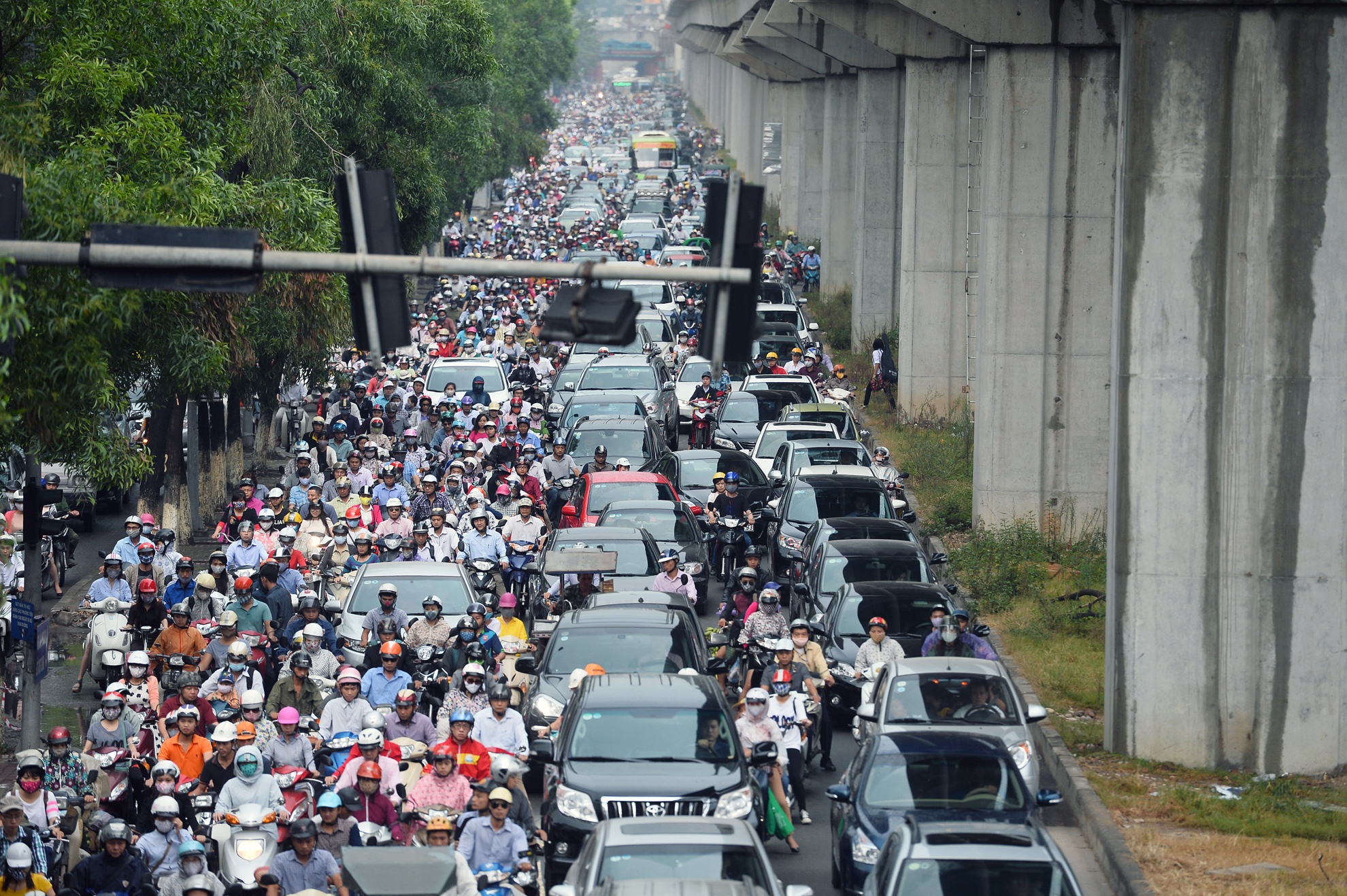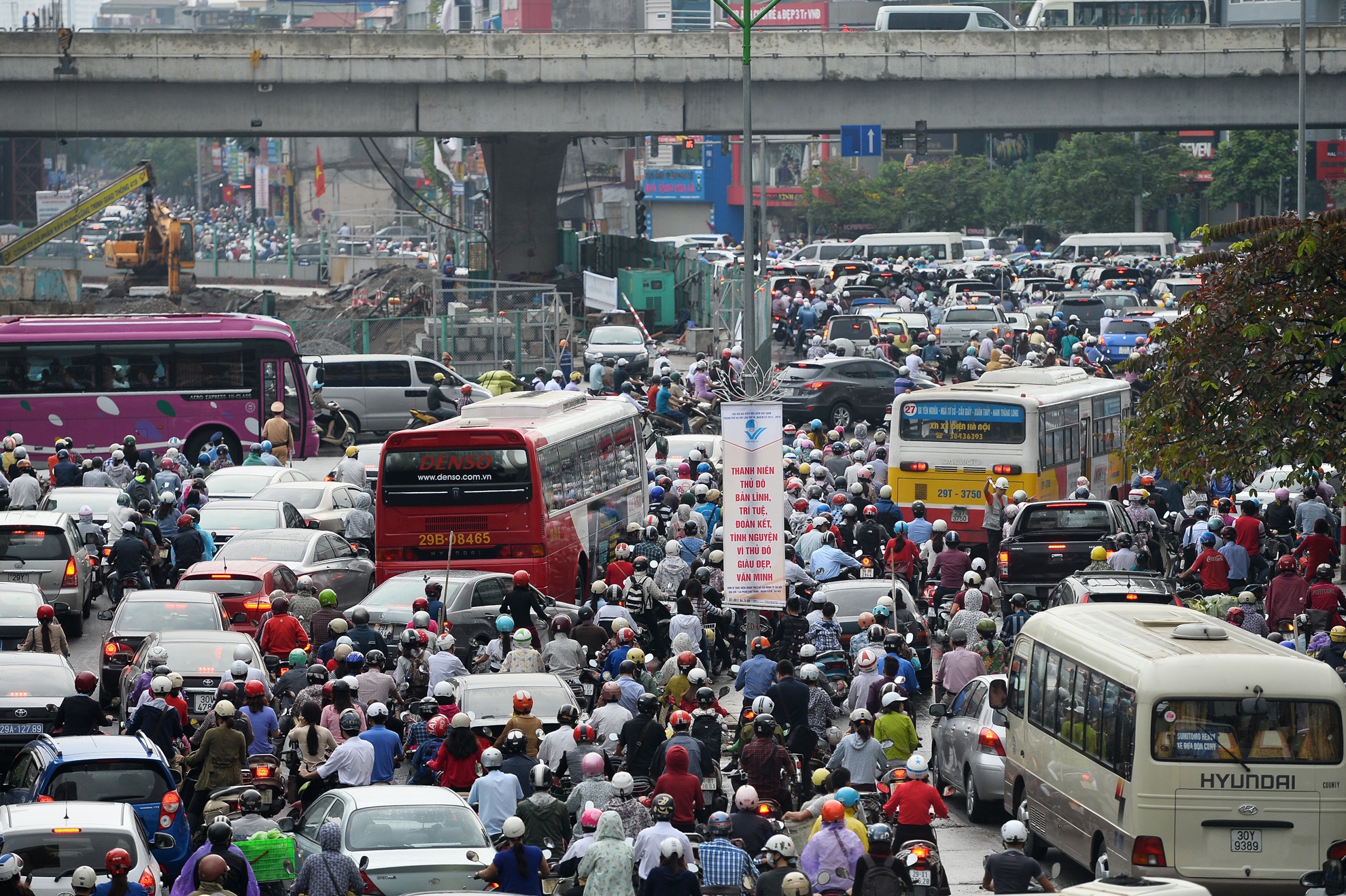 Các phương tiện từ hướng Hà Đông vào cửa ngõ thủ đô muốn qua đây phải nhích từng mét.