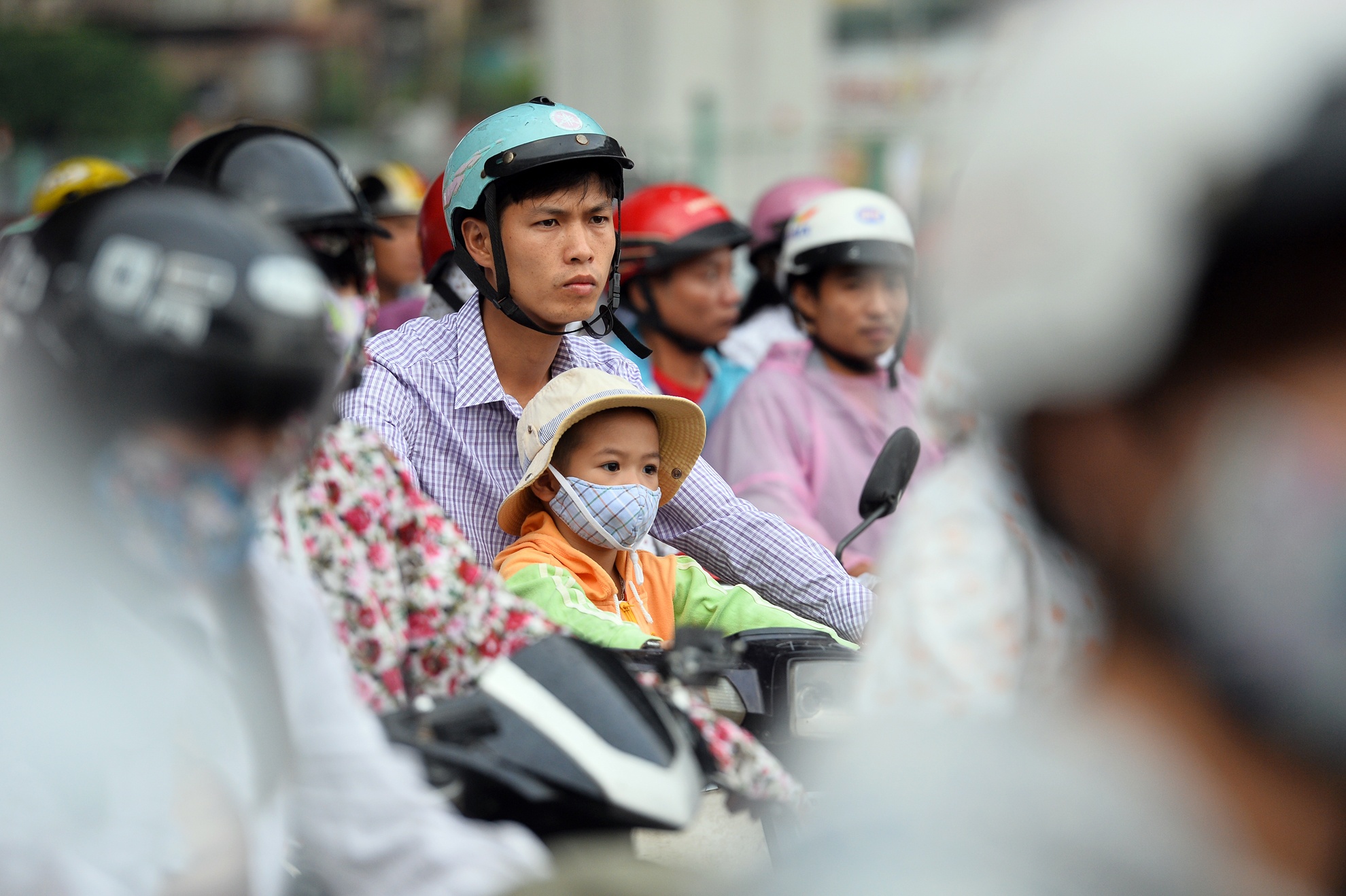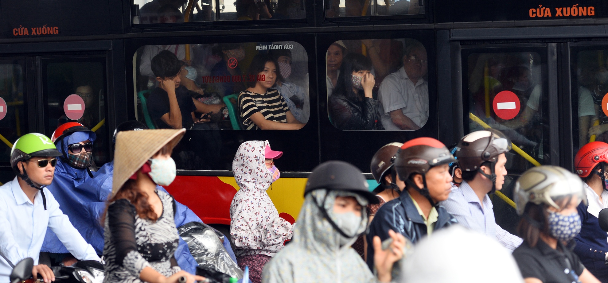 Các tuyến xe buýt qua trục đường này luôn quá tải khiến cho cảnh ngộ trên xe và dưới đường vất vả như nhau.