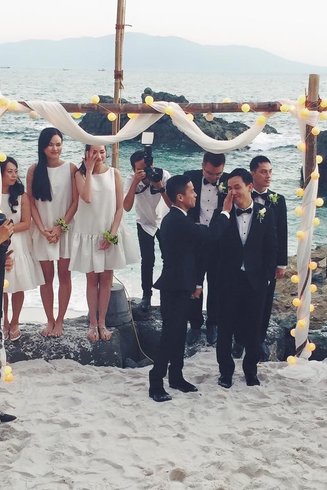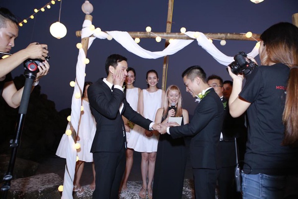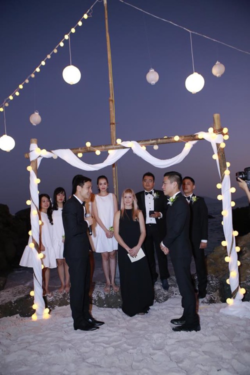 | Tối 24/1, đám cưới đồng tính đầu tiên của làng mốt Việt được tổ chức trong bối cảnh nên thơ, bên bờ biển Nha Trang. Cặp đôi đồng tính - NTK Adrian Anh Tuấn và Sơn Đoàn - diện trang phục vest nổi bật để tiến hành hôn lễ trước sự chứng kiến của bạn bè, đồng nghiệp và người thân. |