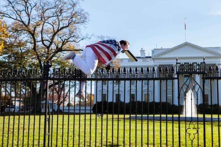| Người đàn ông quấn quốc kỳ Mỹ và trèo rào vào Nhà Trắng ngày 26/11. Ảnh: NYPost |