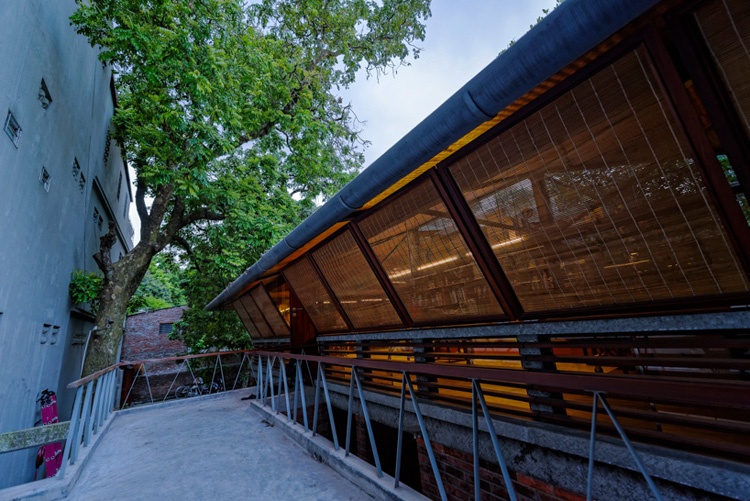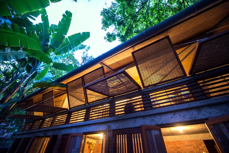 | Lớp cửa sổ bằng liếp, phên tre đặt chéo trên tầng hai giúp ánh sáng có thể len sâu vào trong nhà. Ảnh: Designboom. |