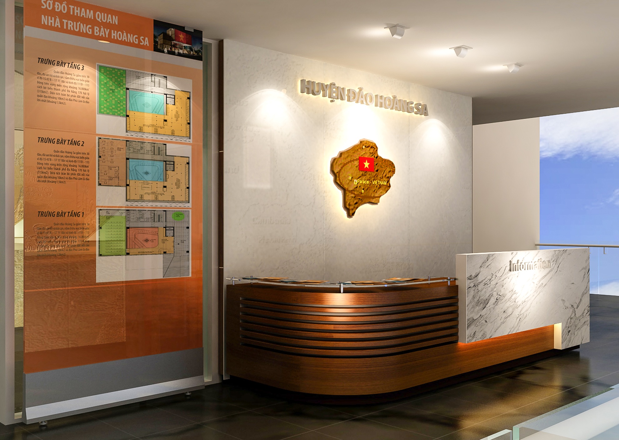 Tòa nhà cao 18 m với 1 tầng trệt, 3 tầng nổi, tổng vốn đầu tư 40 tỷ đồng. Công trình được thiết kế, xây dựng theo phương án kiến trúc "Con dấu chủ quyền của đất nước Việt Nam" theo đồ án của nhóm tác giả Fuminori Minakami (Nhật Bản), Trần Quốc Thành và Nguyễn Huy Quang đã đạt giải thưởng trong cuộc thi tuyển phương án kiến trúc Nhà trưng bày Hoàng Sa năm 2014. Trong ảnh: Mô hình khu lễ tân ở tầng 1 của Nhà trưng bày Hoàng Sa.