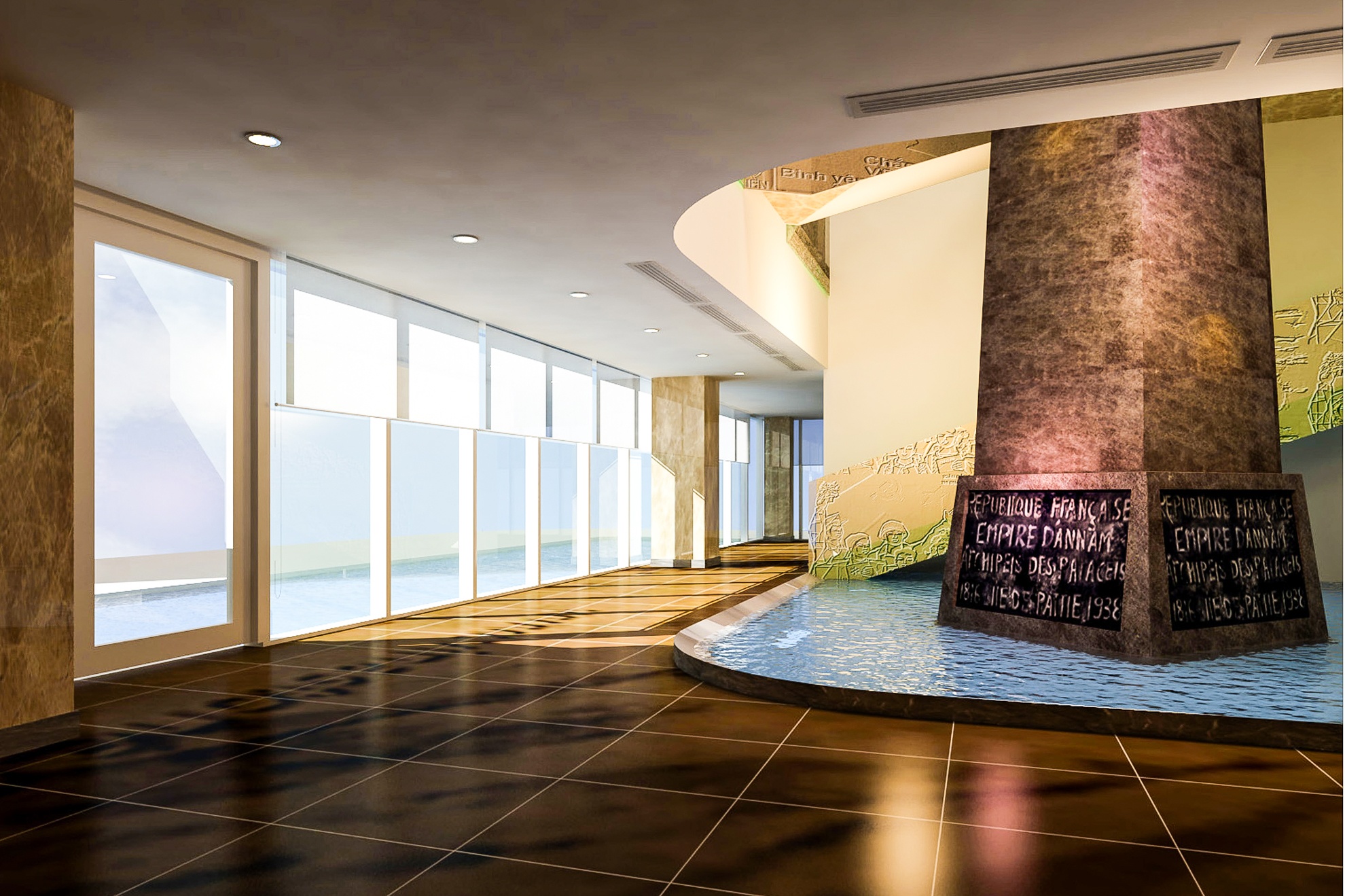 | Khu vực trung tâm của tòa nhà sẽ được tái dựng không gian Cột bia chủ quyền Hoàng Sa của Việt Nam thời Pháp thuộc dựng năm 1938. Cột bia này được xây dựng ngay trên bề mặt của hồ nước rộng 40 m2, với chiều cao thông từ tầng 1 đến tầng 3. |