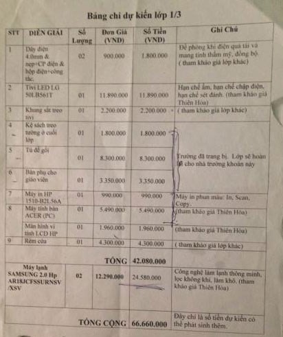 Riêng về khoản tiền gần 13,5 triệu đồng mà phụ huynh đề cập, bà Thanh giải thích, do trước đó nhà trường đặt mua giúp học sinh kệ sách treo tường có giá 1,8 triệu đồng, tủ để gối 8,3 triệu đồng và bàn phụ cho giáo viên hơn 3,3 triệu đồng. Điều đáng nói là cả 3 vật dụng này đều chưa qua quy trình tham khảo ý kiến của phụ huynh. Vì thế, rất có thể đây là nguyên nhân khiến phụ huynh cảm thấy không hài lòng.