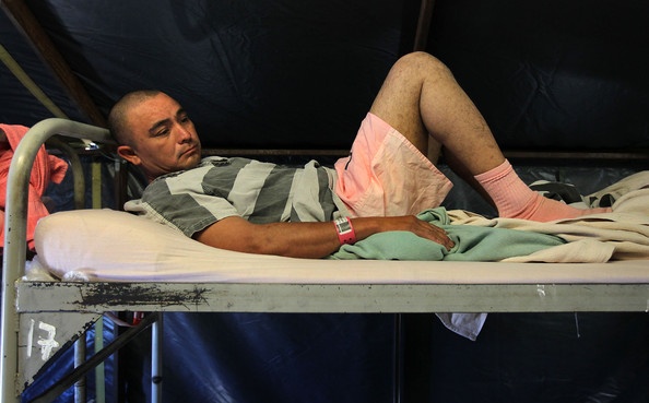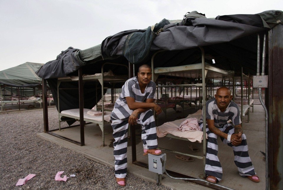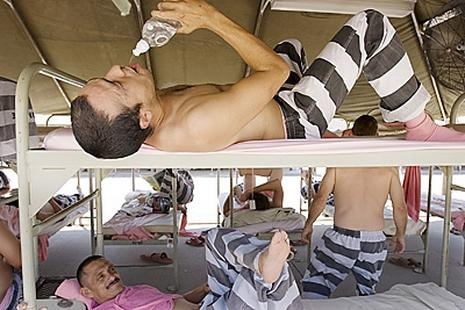 Các tù nhân đang nghỉ giải lao tại Tent city, khu vực mở rộng của nhà tù Maricopa. Ông Arpaio từng mô tả Tent city giống như trại tập trung. Chính vì việc thành lập Tent city mà ông Arpaio từng vấp phải nhiều lời chỉ trích. Phạm nhân tại Tent city phải ở trong những lều tạm trong thời tiết nắng nóng như thiêu đốt ở Azirona. Ảnh: Getty Images.