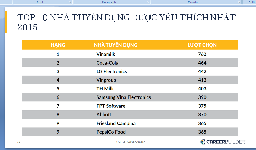 | Top 10 nhà tuyển dụng được yêu thích nhất năm 2015 theo khảo sát của Career Builder Việt Nam. |