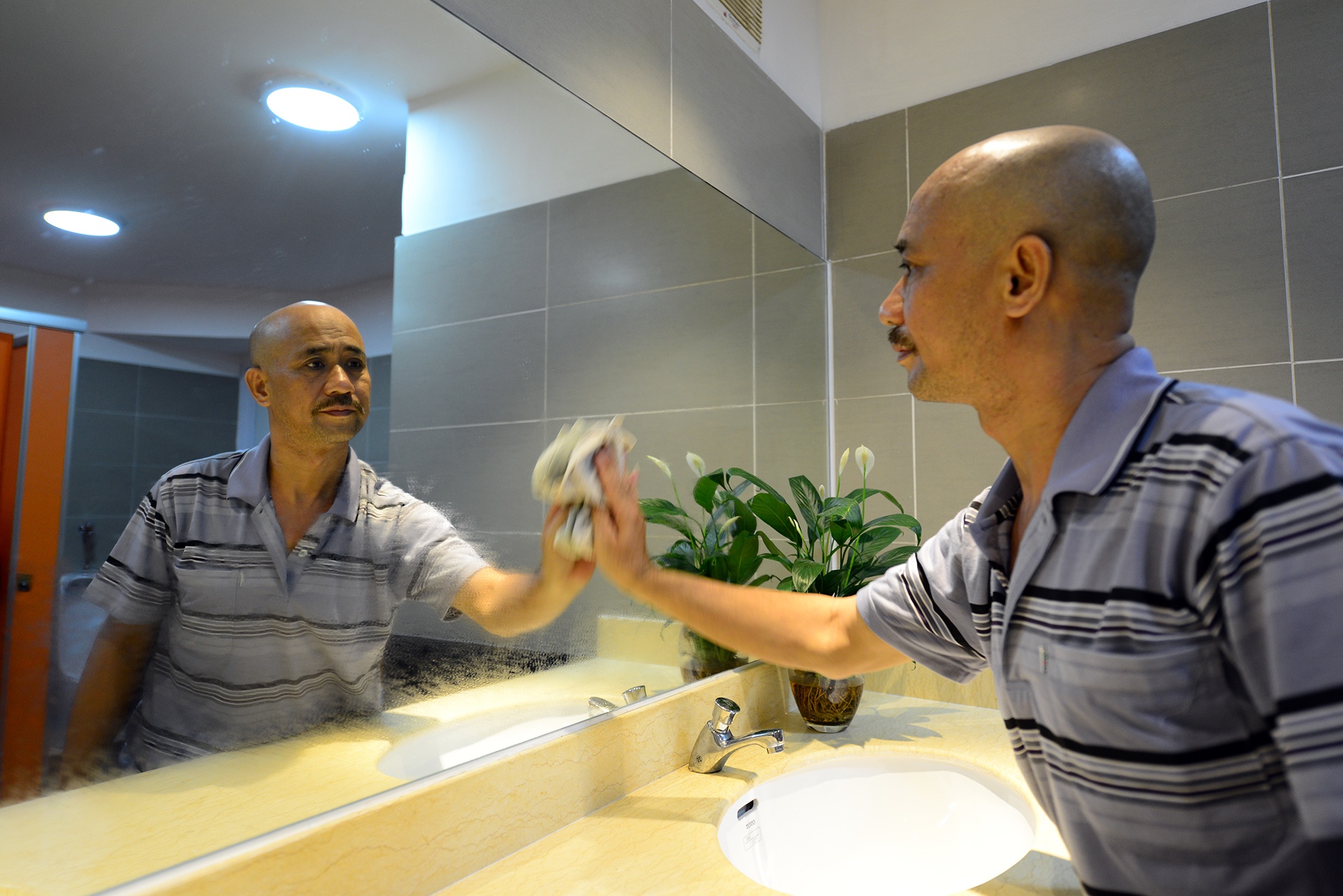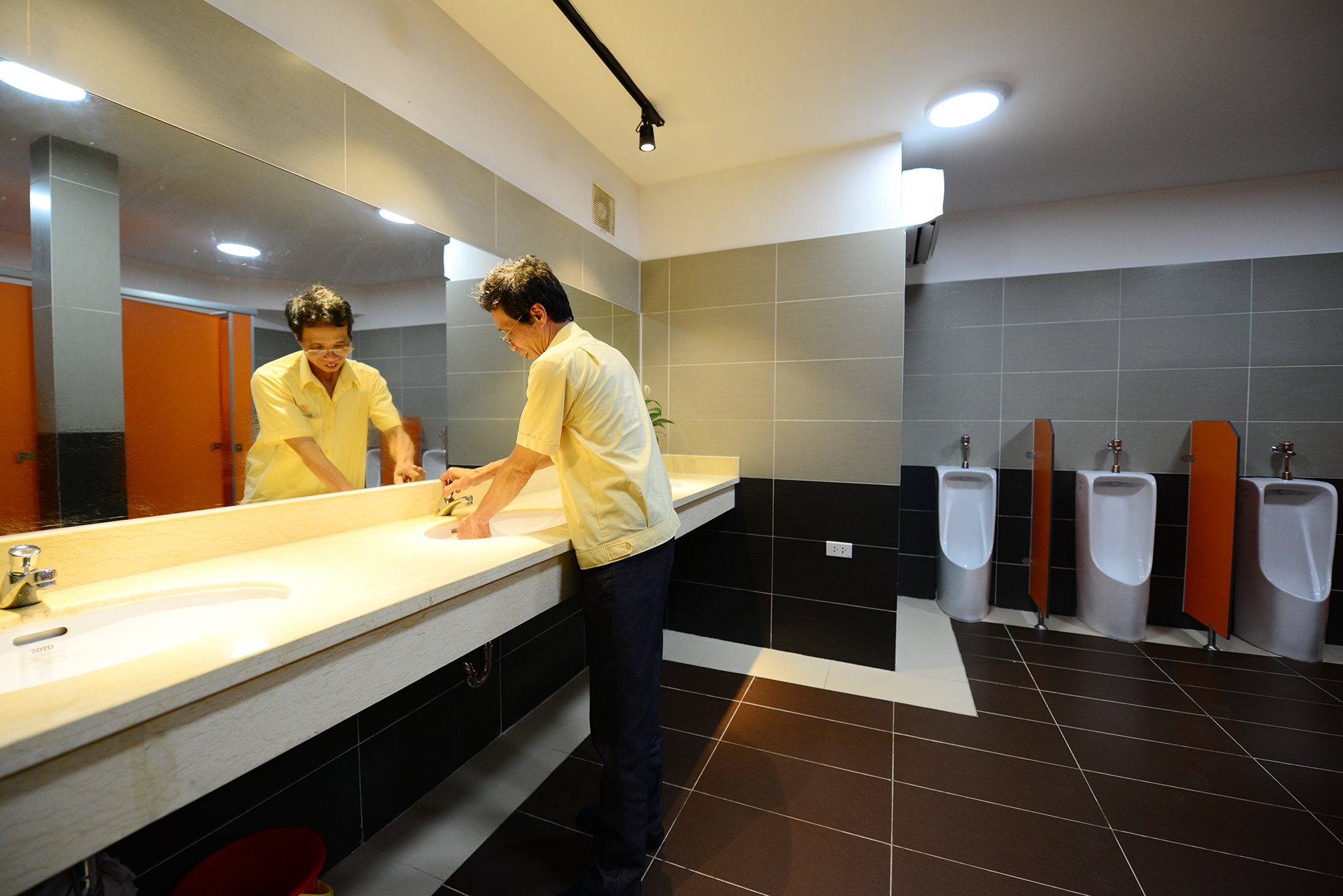 Hai nhân viên của công ty thay phiên nhau trực, dọn dẹp từ sáng sớm cho tới nửa đêm đảm bảo luôn sạch sẽ.