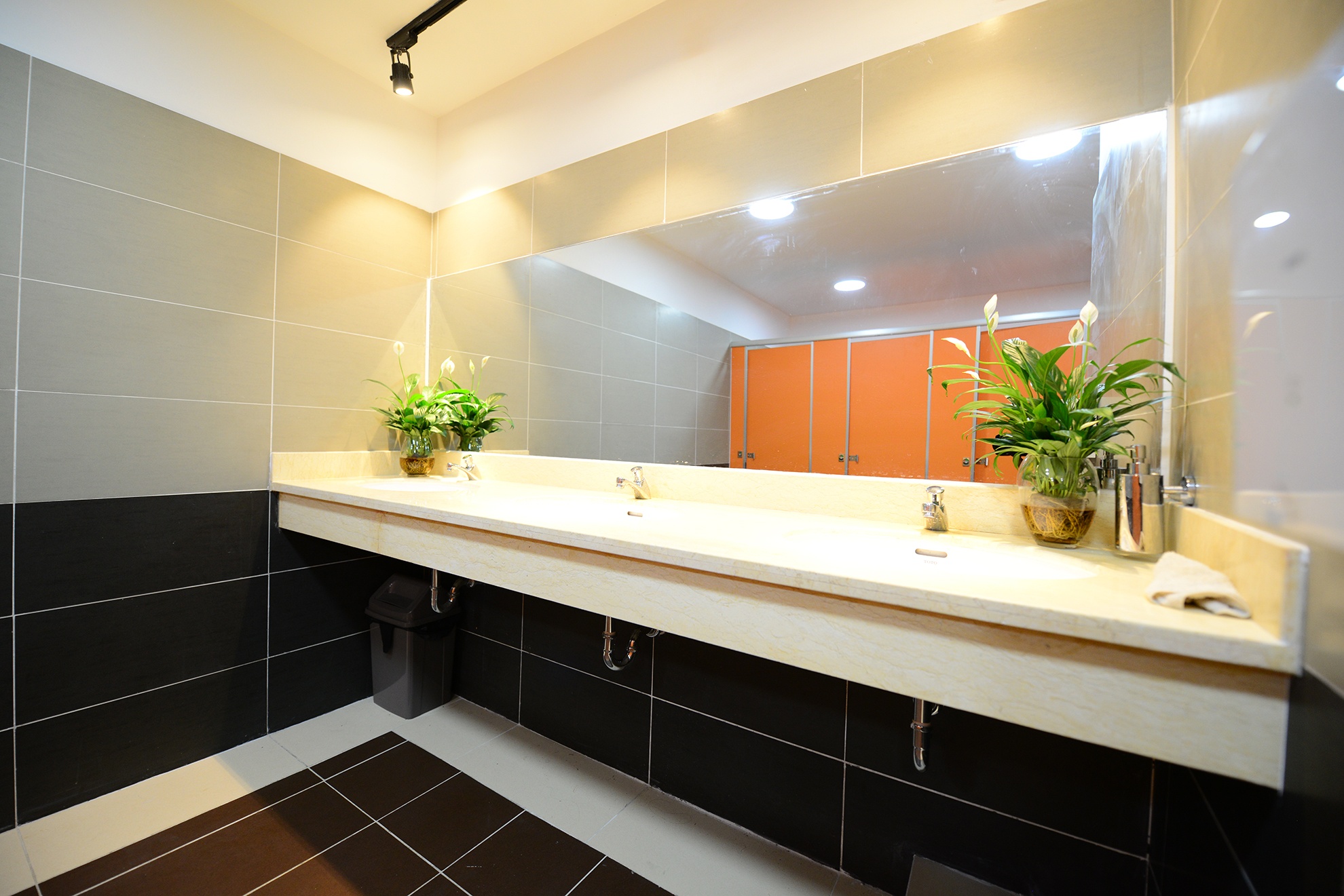 Buồng vệ sinh dành cho phụ nữ được trang trí các bình cây hoa, tươi mới.