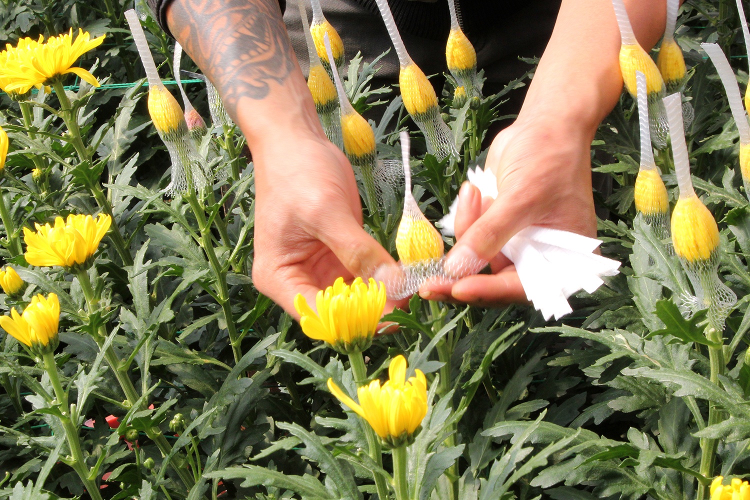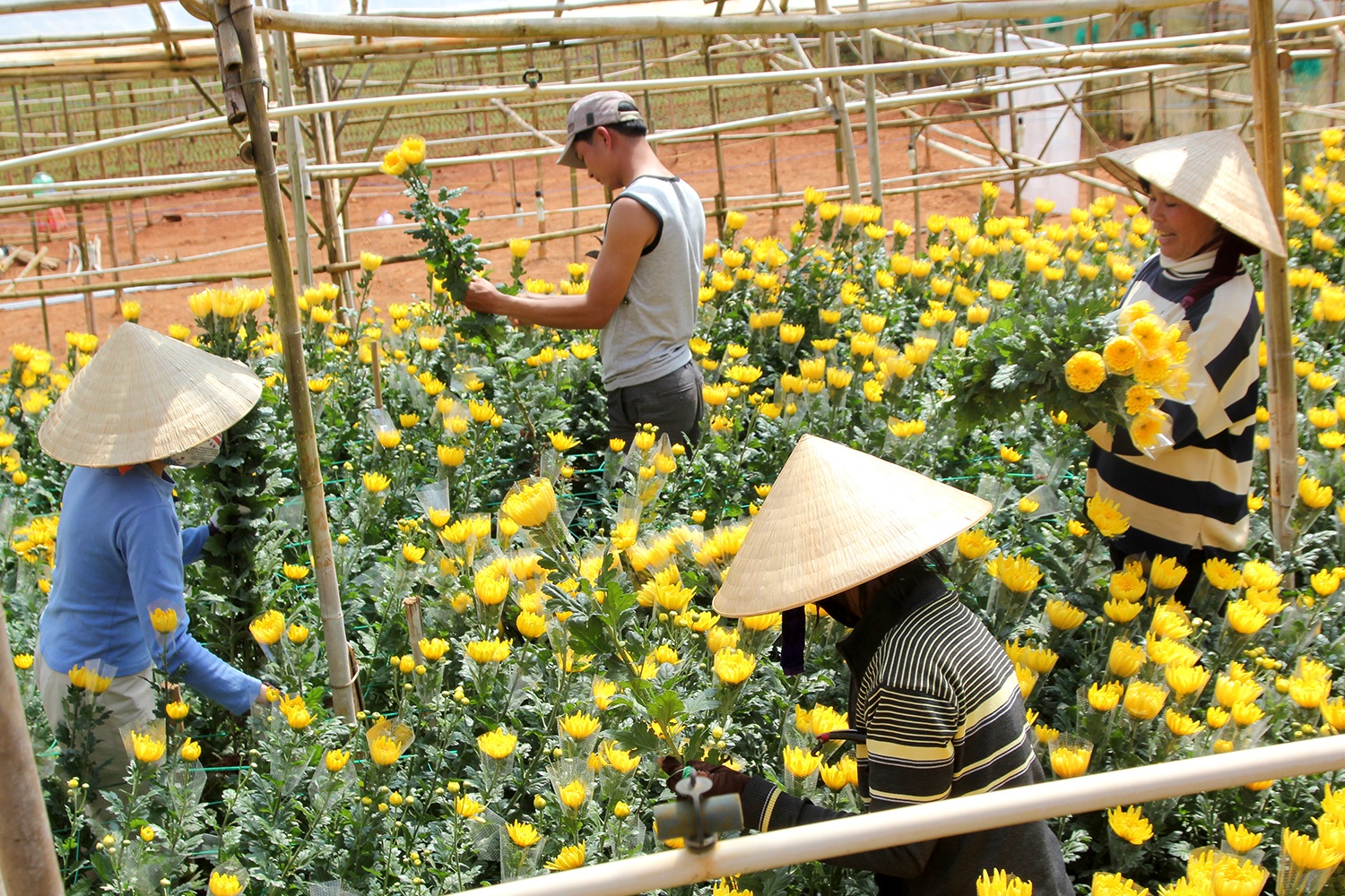 Hoa cúc vàng ở đây luôn được bọc lưới hoặc phễu nhựa cẩn thận trước khi cắt bán, để giữ cánh hoa không bị rụng trong quá trình vận chuyển.