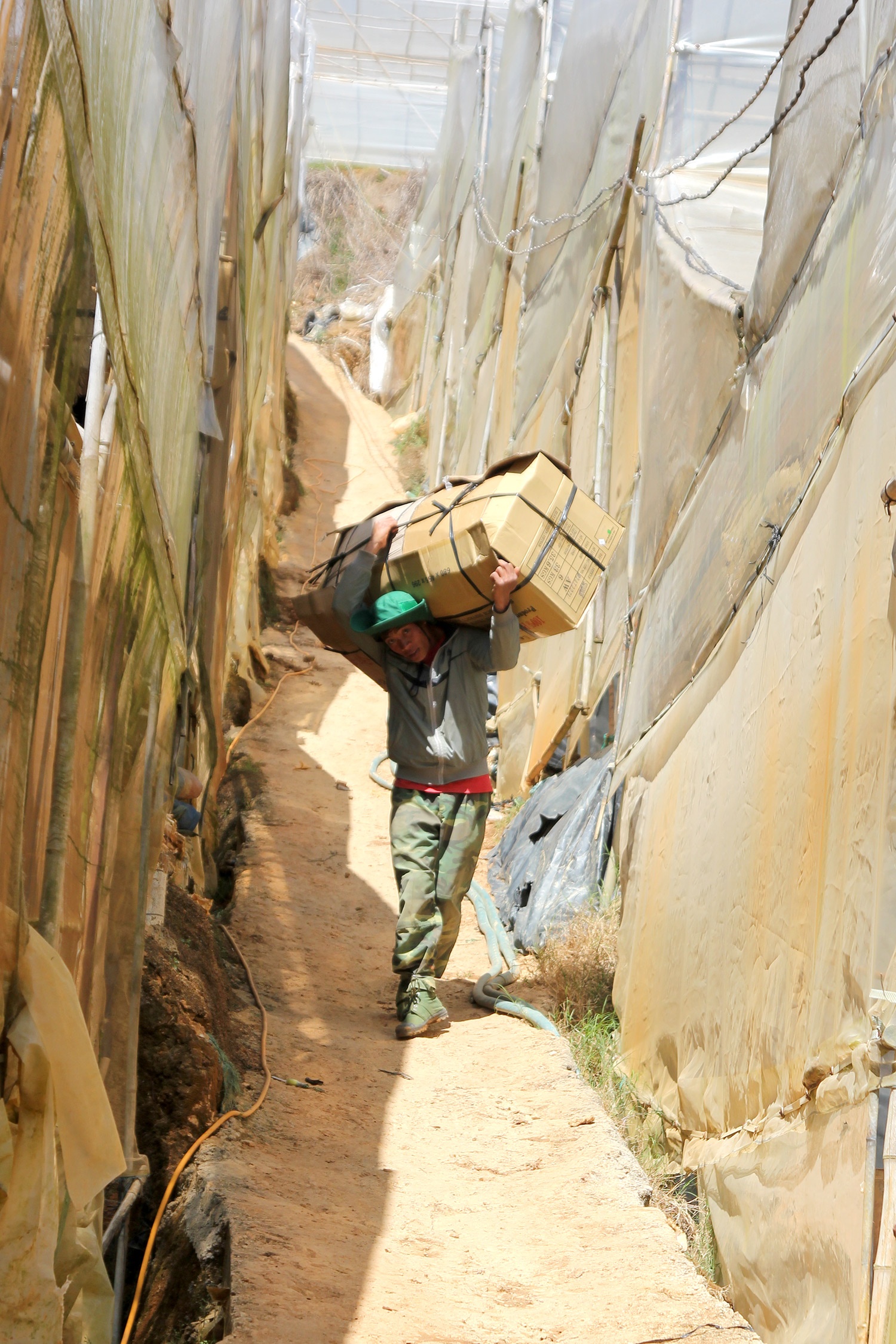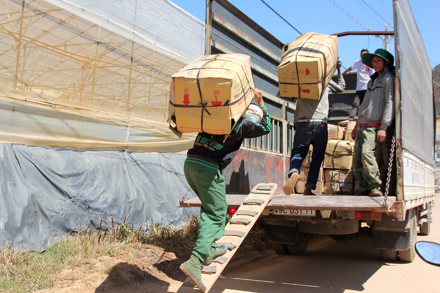 Sau khi đóng thùng, hoa được đưa từ vườn về nơi tập kết. Mỗi thùng giấy như thế này chứa được 150 - 200 bó hoa.
