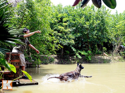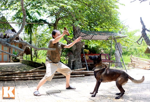 | Vào mỗi buổi sáng, Giang Còi và chú chó cưng thường vui đùa trong vườn, bên cạnh chiếc ao nhỏ. |