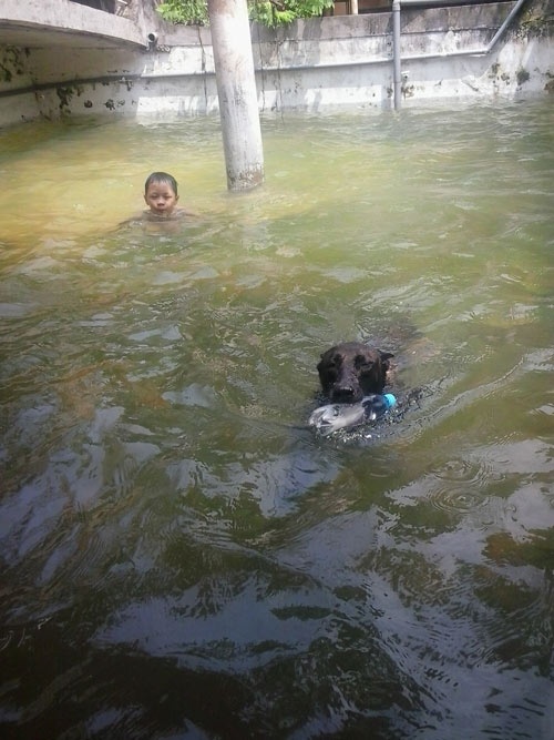 | Cậu con trai út của diễn viên Giang Còi đang vui chơi dười hồ bơi cùng chú chó. |