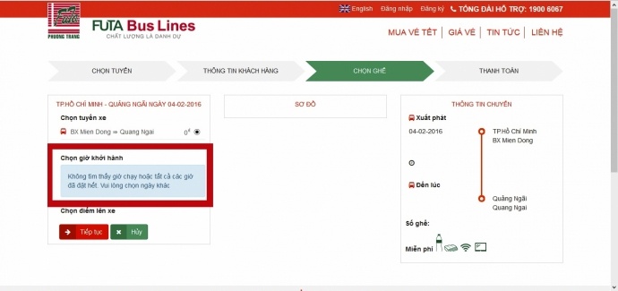 Thử vào trang mạng của nhà xe, phóng viên thấy không xảy ra tình trạng nghẽn mạng nhưng đã thông báo hết ghế.