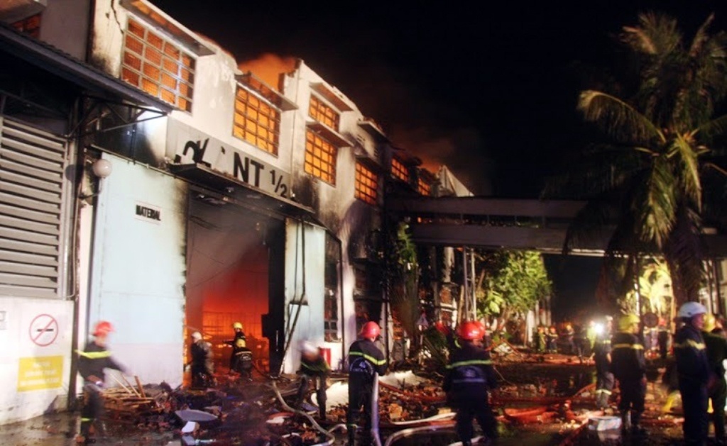 Dãy nhà xưởng của công ty chuyên sản xuất giầy thể thao tại Củ Chi bốc cháy dữ dội sau tiếng nổ vào giữa đêm. Lực lượng PCCC huy động hơn 100 chiến sĩ đến hiện trường dập lửa.