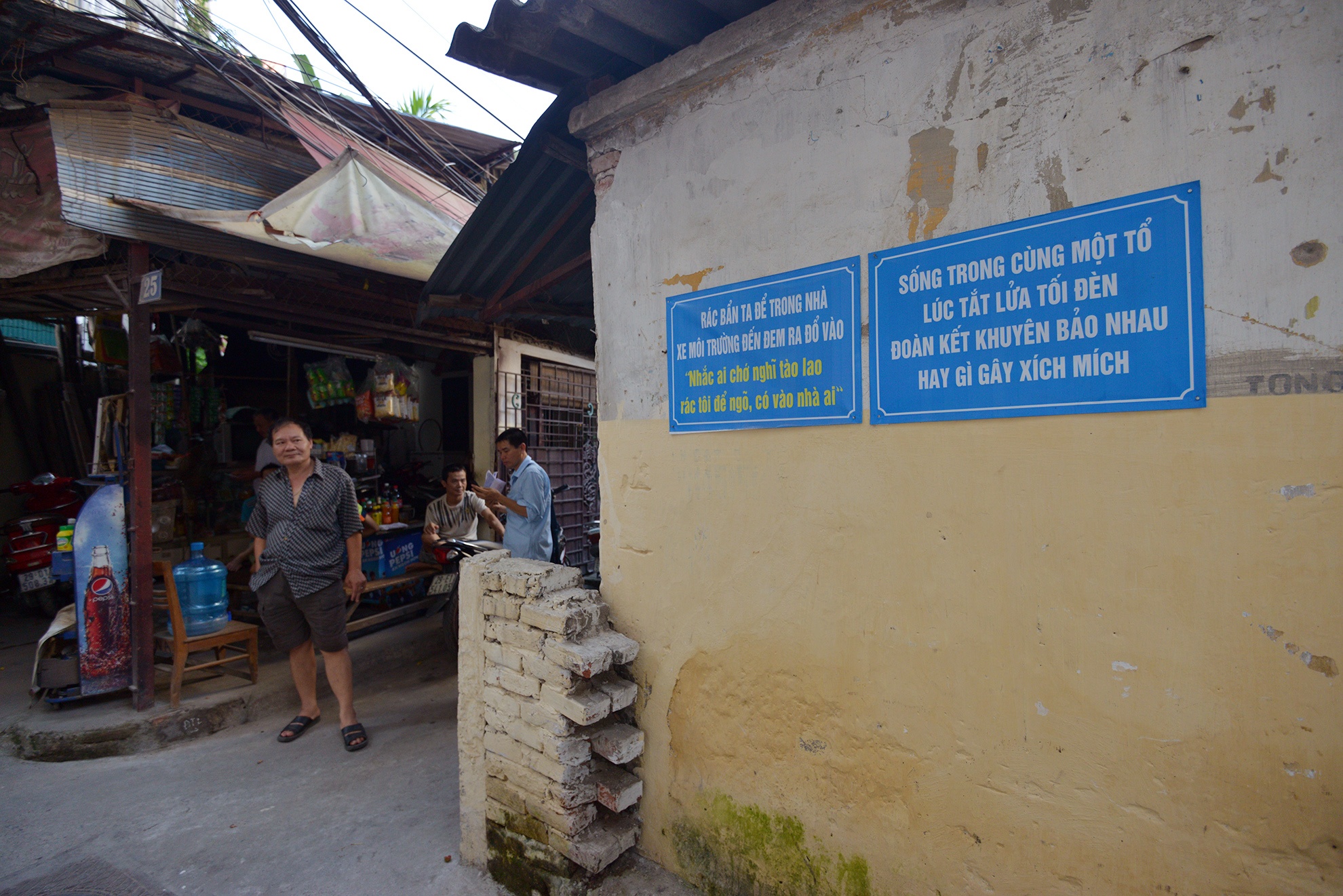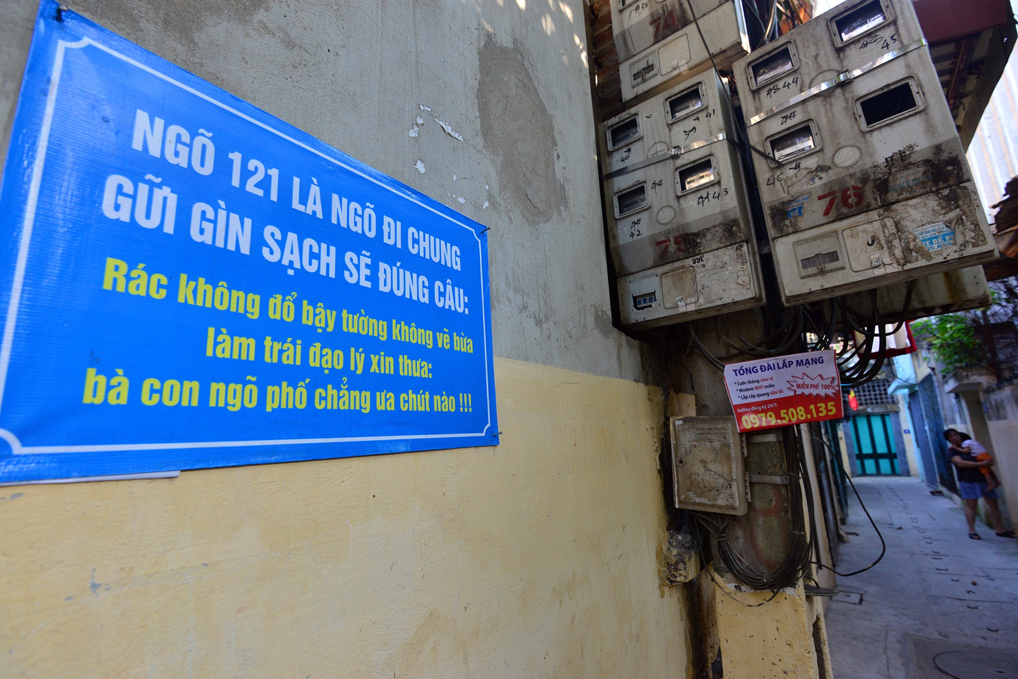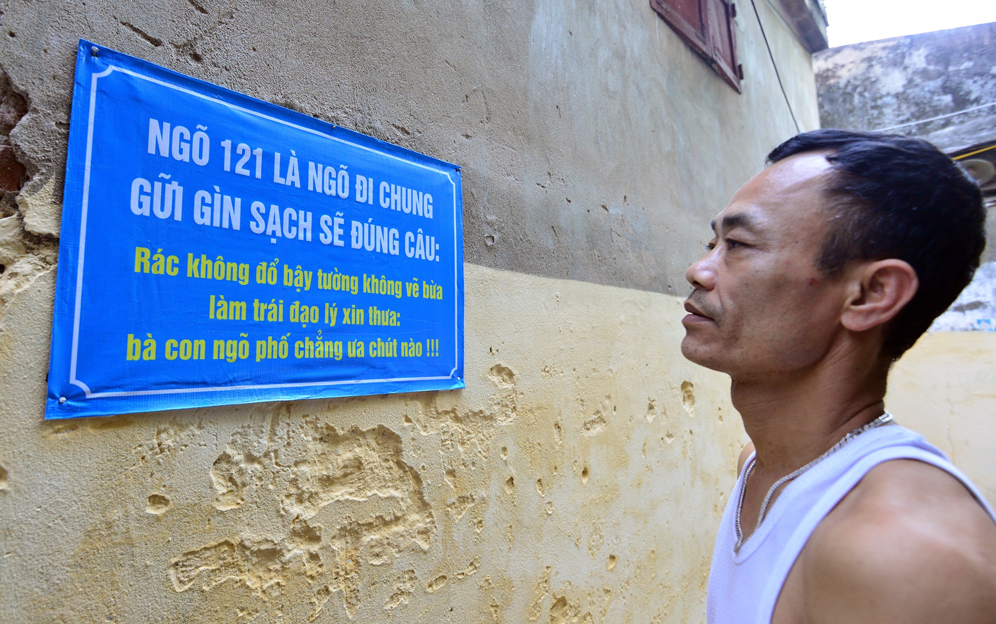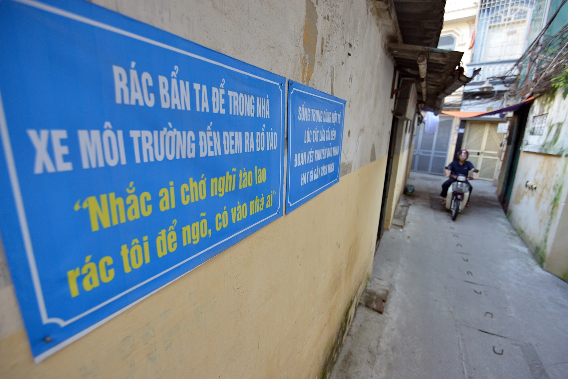 Khoảng 20 tấm biển viết lên các vần thơ có nội dung nhắc nhở đổ rác đúng quy định, giữ gìn môi trường hay chuyện tối lửa tắt đèn có nhau được treo lên khắp các ngõ nhỏ vào nhà.