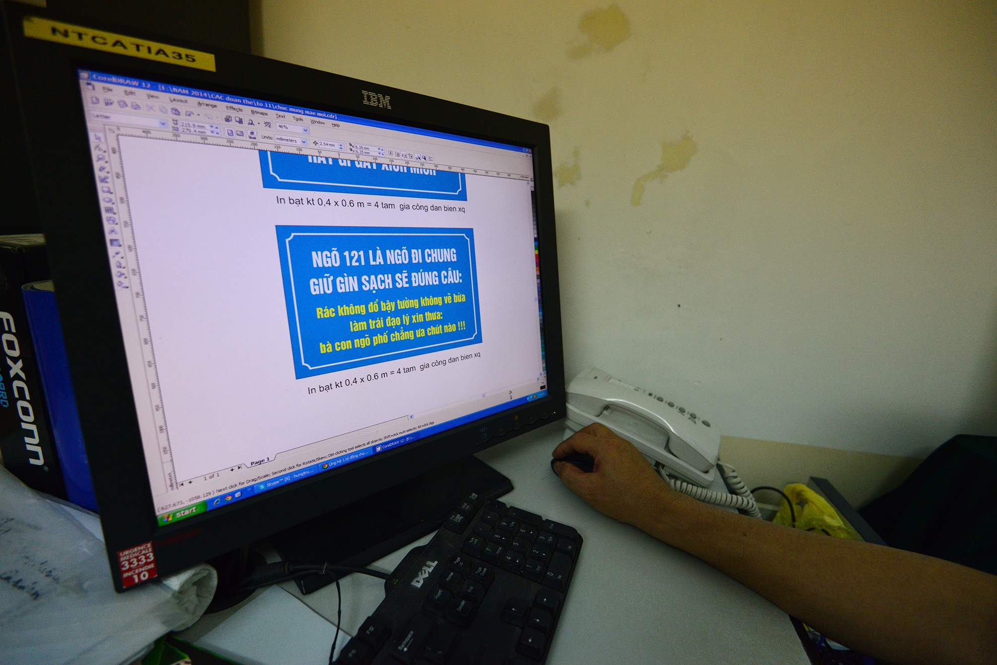 Những tấm biển được in lên vải bạt, chiều dài chừng 60cm, rộng 30cm do vị tổ trưởng dân phố tự tay thiết kế.