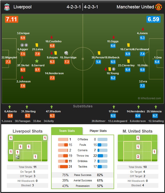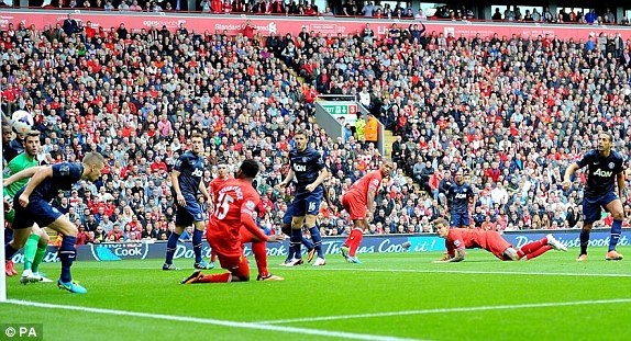 Về phía Liverpool, CLB vùng Merseyside quyết tâm giành chiến thắng thứ 3 liên tiếp ở mùa này. Sau khi trận đấu diễn ra được 4 phút, đội chủ nhà bất ngờ có bàn thắng dẫn trước do công của Daniel Sturridge. Từ tình huống phạt góc bên cánh phải, Daniel Agger đánh đầu đến vị trí của Sturridge, và chân sút người Anh chạm bóng khá tinh tế xuyên thủng mành lưới MU.
