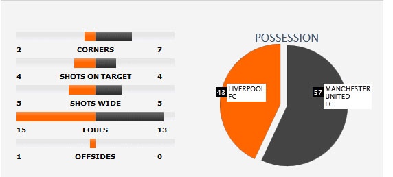 Sau khi bị dẫn trước, đội khách tích cực chơi tấn công nhằm tìm kiếm bàn gỡ ngay trong hiệp 1. Tuy nhiên, cầu thủ Liverpool đã tạo ra được khoảng cách hợp lý giữa các vị trí trên sân bằng cách chịu khó di chuyển. Đây chính là yếu tố khiến MU gặp rất nhiều khó khăn trong việc tiếp cận khung thành của thủ môn Mignolet.