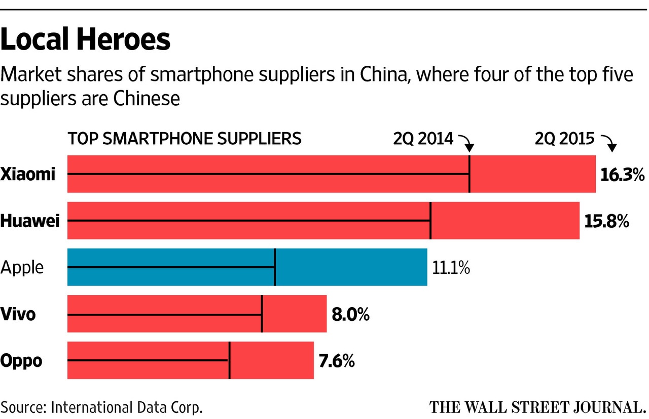 Ngoài ra, nhu cầu mua sắm thiết bị mới của người dùng Trung Quốc cũng chậm lại. Hãng Gartner chỉ ra lượng smartphone xuất xưởng quý II/2015 giảm 4% so với cùng kỳ năm 2014, đánh dấu bước lùi đầu tiên. IDC hạ mức dự báo tăng trưởng thị trường smartphone năm 2015 từ 2,5% xuống 1,2%.