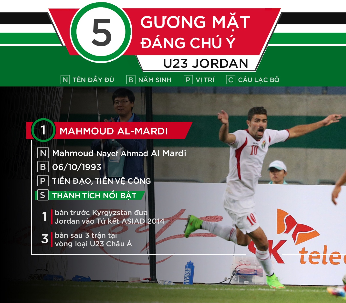 Mahmod Al-Mardi chính là người ghi bàn vào lưới U23 Kyrgyzstan, qua đó đưa U23 Jordan vượt qua vòng 1/8 với chiến thắng 2-0, vào tứ kết ASIAD 2014 tại Incheon, Hàn Quốc. Cầu thủ sinh năm 1993 được kỳ vọng sẽ tiếp tục mũi nhọn trên hàng công của U23 Jordan tại Vòng chung kết U23 châu Á 2016. |