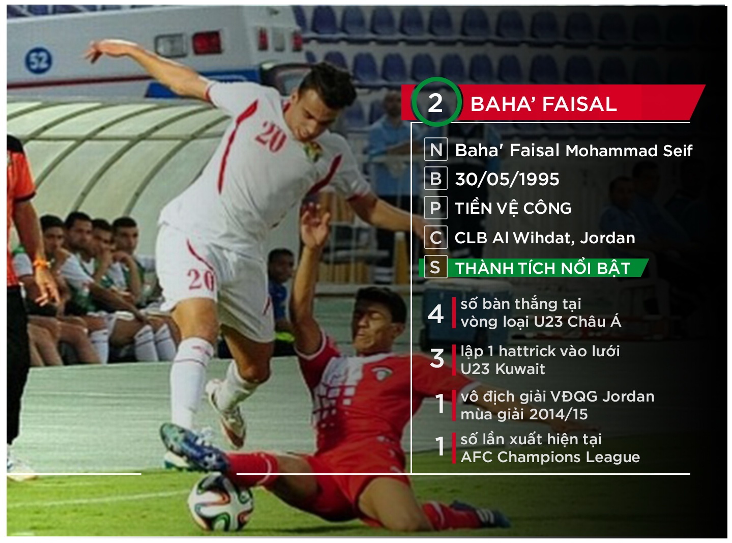 Baha Faisal là 'Vua phá lưới' vòng loại của U23 Jordan khi ghi được tới 4 bàn thắng, giúp U23 Jordan giành vé dự VCK với tư cách đội nhất bảng B. |
