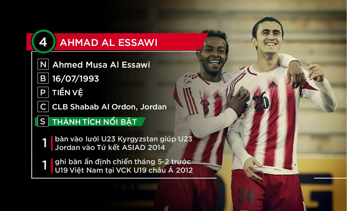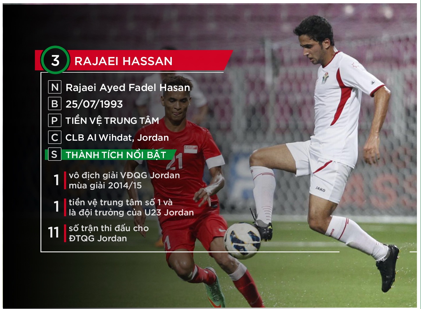 | Tiền vệ đội trưởng Rajaei Hassan với khả năng công, thủ toàn diện sẽ là thử thách không nhỏ với những Duy Mạnh, Hữu Dũng, Xuân Trường, Tuấn Anh. Xét về kinh nghiệm thi đấu cho ĐTQG, sao trẻ người Jordan vượt trội hoàn toàn so với những người chơi cùng vị trí ở U23 Việt Nam. |