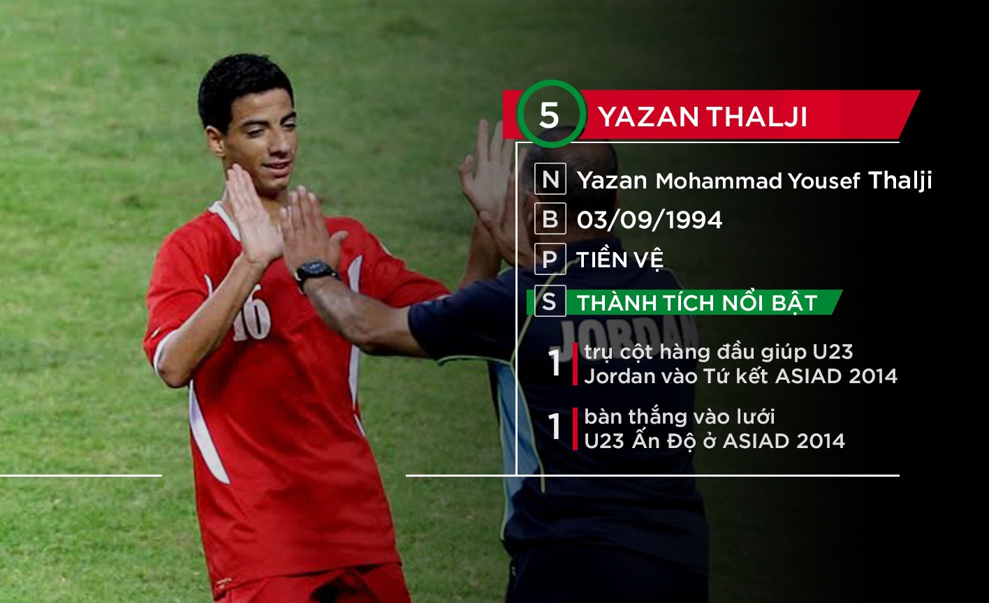 | Là một trong những trụ cột giúp U23 Jordan vào tứ kết ASIAD 2014. Yazan Thalji và các đồng đội sẽ tiếp tục duy trì lối chơi gắn kết mà ban huấn luyện đã xây dựng trong 2 năm trở lại đây. Trong khi đó, những trụ cột của U23 Việt Nam thời ASIAD 2014 như Huy Toàn, Ngọc Thắng, Ngọc Hải đã vắng mặt tại Vòng chung kết U23 châu Á 2016 vì những lý do khác nhau. |