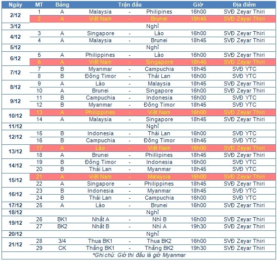 (Theo giờ nước chủ nhà SEA Games Myanmar, UTC +6:30)