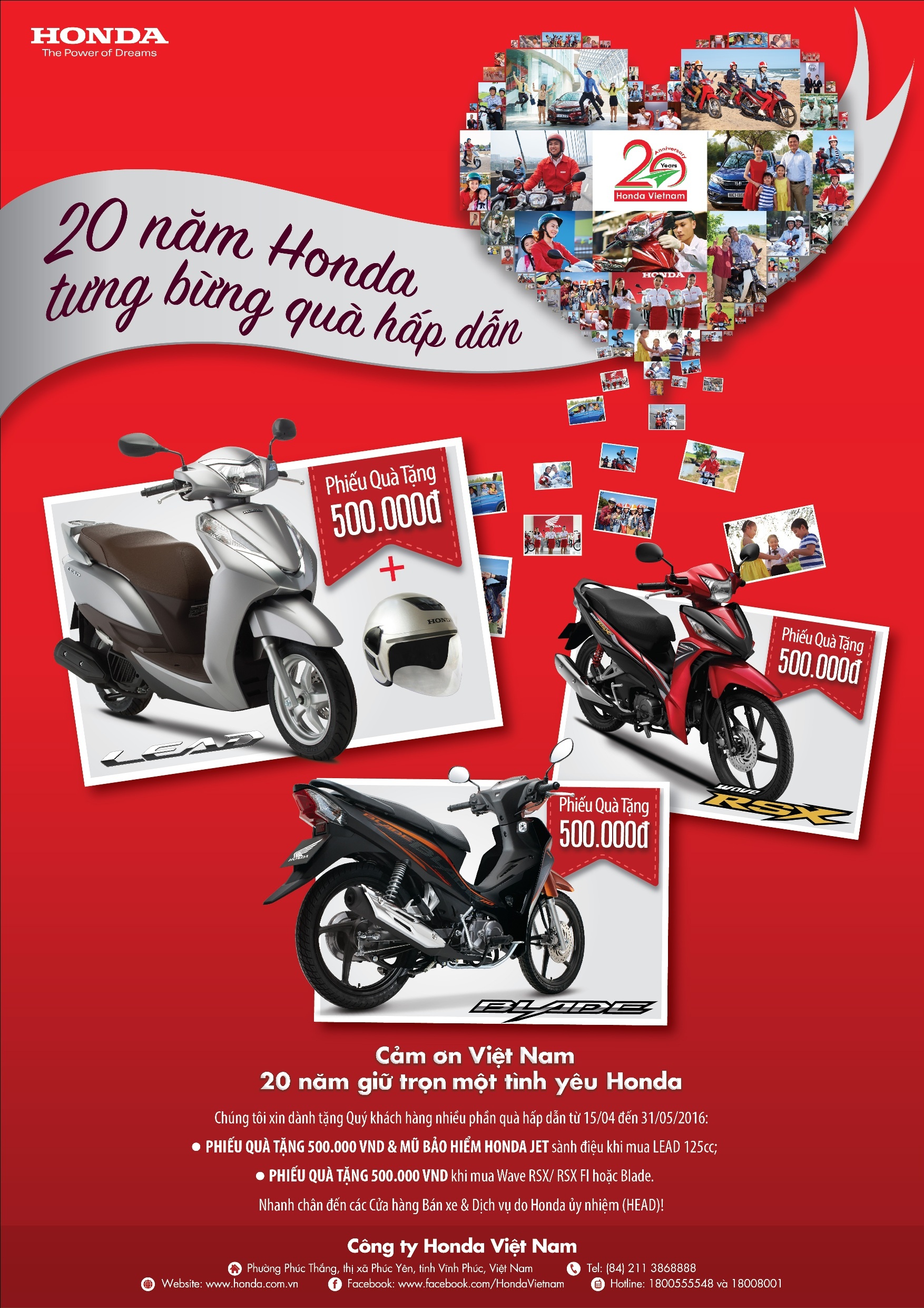 Cụ thể, Honda Việt Nam sẽ thực hiện chương trình khuyến mãi với tên gọi 20 năm Honda, tưng bừng quà hấp dẫn diễn ra từ ngày 15/4 đến hết 31/5. Khách hàng sẽ được nhận một phiếu quà tặng trị giá 500.000 đồng (phiếu quà tặng không được quy đổi thành tiền mặt hoặc các mục đích sử dụng khác như mua phụ tùng hoặc sử dụng dịch vụ tại HEAD). Phiếu áp dụng khi mua một trong những mẫu xe đang được ưa chuộng hiện nay của Honda Việt Nam: LEAD, Wave RSX, Wave RSX FI và Blade tại các cửa hàng bán xe và dịch vụ do Honda Ủy nhiệm (HEAD) trên toàn quốc. Đặc biệt, khách hàng mua xe LEAD còn được tặng thêm một mũ bảo hiểm Honda Jet sành điệu.