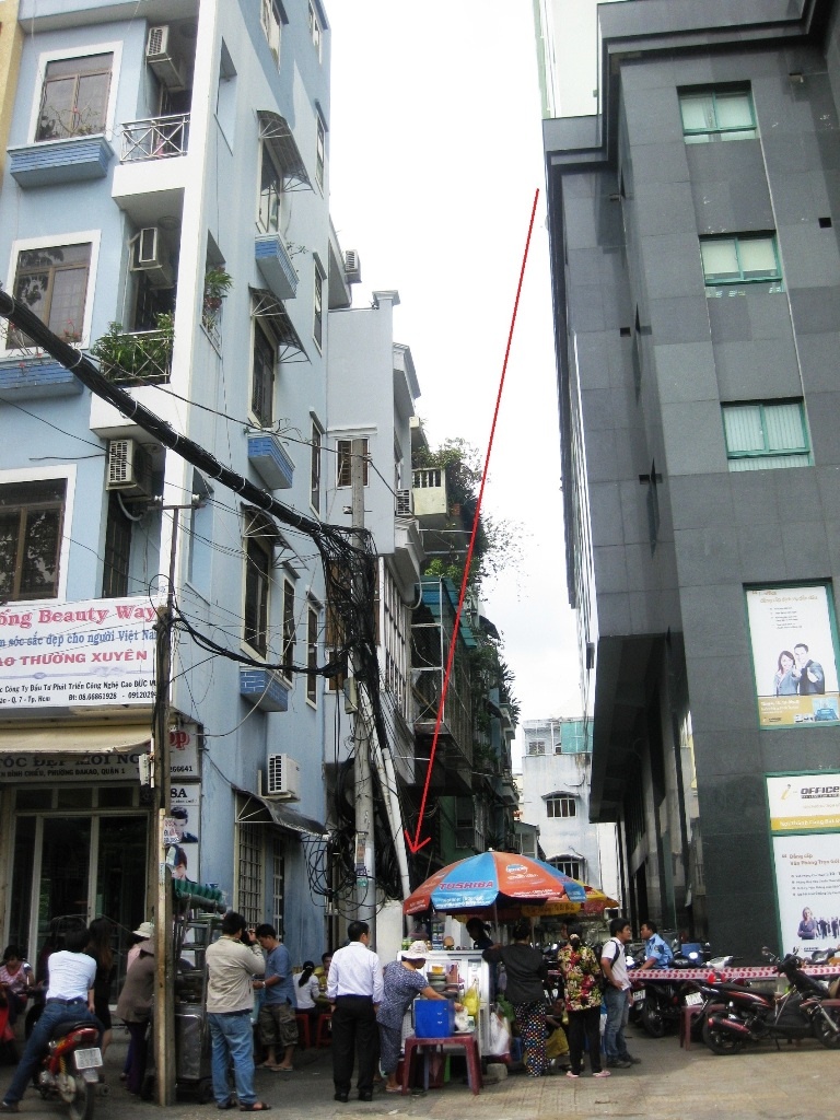 | Vị trí người đàn ông rơi từ tòa nhà xuống khu dân cư bên cạnh. |