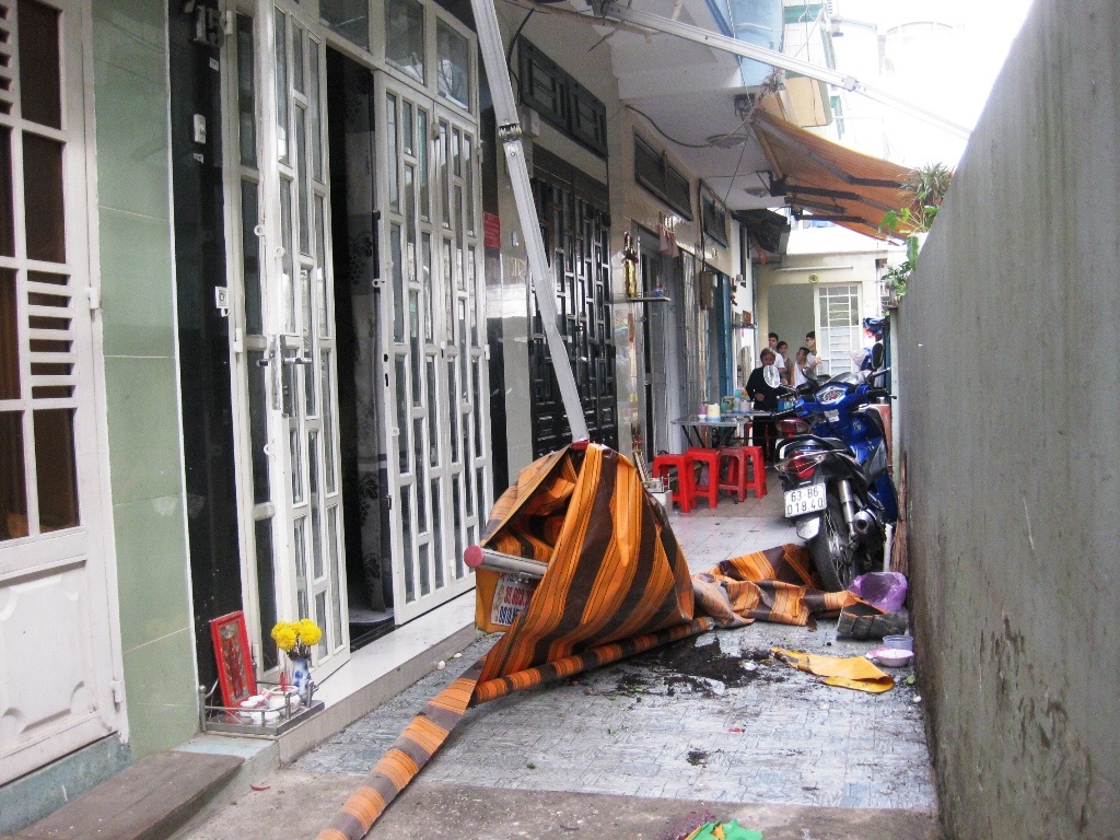 Theo quan sát tại hiện trường, khu dân cư nằm cách tòa nhà khoảng 2m, mái hiên di động hư hỏng hoàn toàn, một chậu cây cảnh bị vỡ. Những người chứng kiến cho biết, nạn nhân mặc áo sơ mi, quần tây đen, đi giầy tây, có thể là người làm việc trong tòa nhà trên.