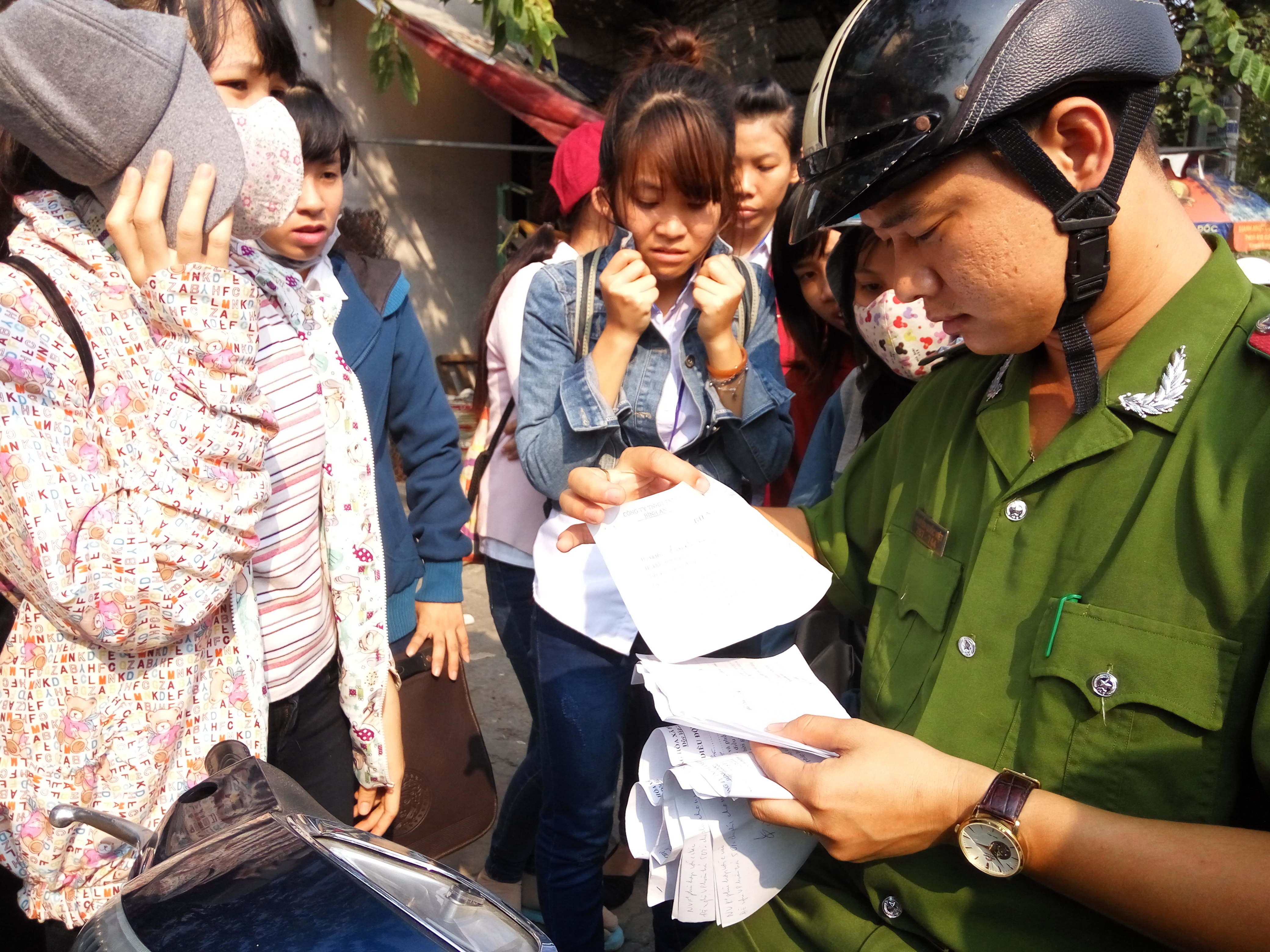 | Hàng chục sinh viên đưa biên lai đã đóng tiền cho công an phường để kiểm tra. Ảnh: Khánh Trung. |