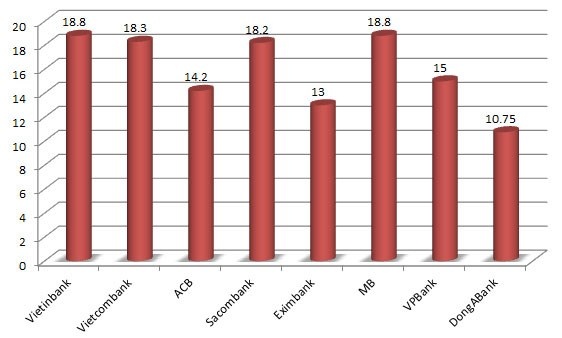 Mức thu nhập bình quân thấp nhất ghi nhận ở con số 10,75 triệu đồng/tháng tại DongABank. Mức lương bình quân này đã thấp hơn so với con số trên 20 triệu đồng/tháng cách đây vài năm, tuy nhiên, đây vẫn là con số hấp dẫn và đáng mơ ước nếu so sánh trên bình diện các công việc khác.