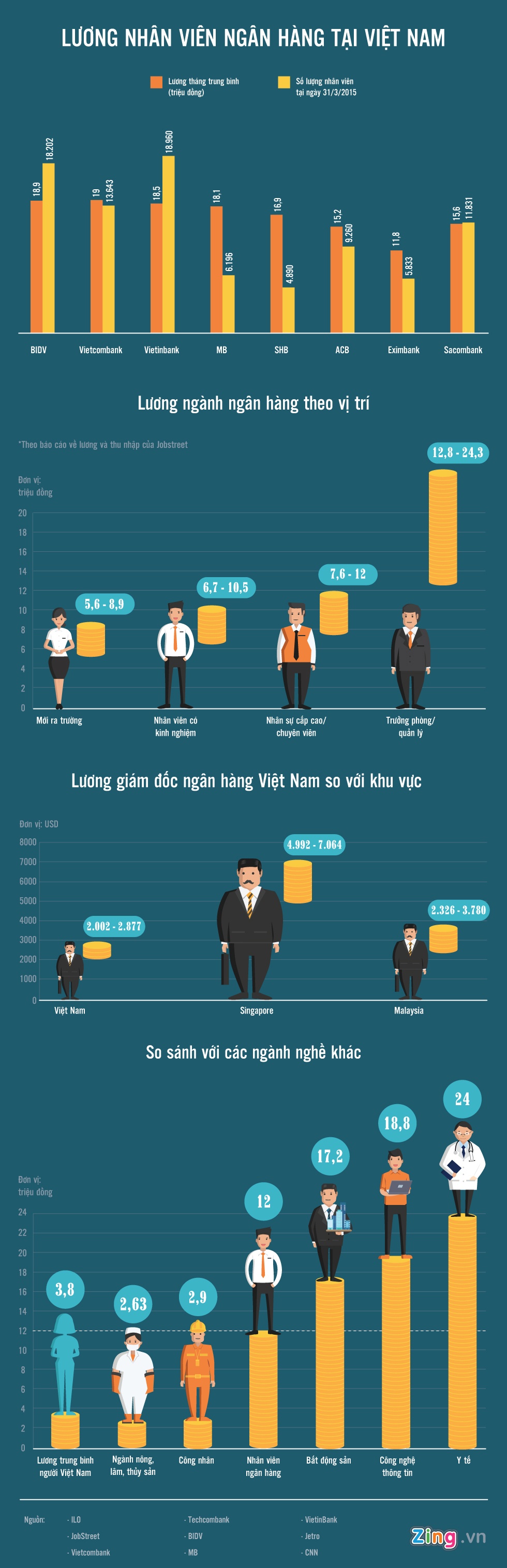Thu nhập bình quân của nhân viên ngân hàng ở Việt Nam là 12 triệu đồng một tháng, cao gấp hơn 3 lần so với lương trung bình người Việt song lại thấp hơn một số ngành.