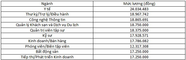 Trong đó, dẫn đầu là ngành y tế, khi nhân viên làm việc trong lĩnh vực này nhận lương trung bình trên 24,03 triệu đồng một tháng. 4 vị trí tiếp theo bao gồm chuyên viên văn phòng, công nghệ thông tin hay quản lý trong dịch vụ du lịch đều có mức lương tháng ngang ngửa, hơn 18,5 triệu đồng.