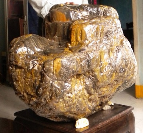 Còn thân cây gỗ hóa thạch có chiều dài khoảng 60cm, đường kính chỗ lớn nhất khoảng 25cm, nặng khoảng 40kg. Nhiều người dân chơi đá kéo nhau đến nhà anh Nam xem và hỏi mua nhưng anh Nam lắc đầu.