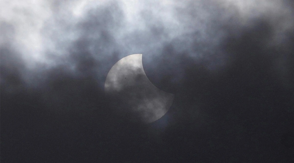 | Nhật thực vẫn được quan sát rõ qua bầu trời nhiều mây ở Jakarta, Indonesia. Đây là một trong những thành phố có thể quan sát rõ nhất hiện tượng nhật thực ngày 20/4. Ảnh: Time and Date; AP. |